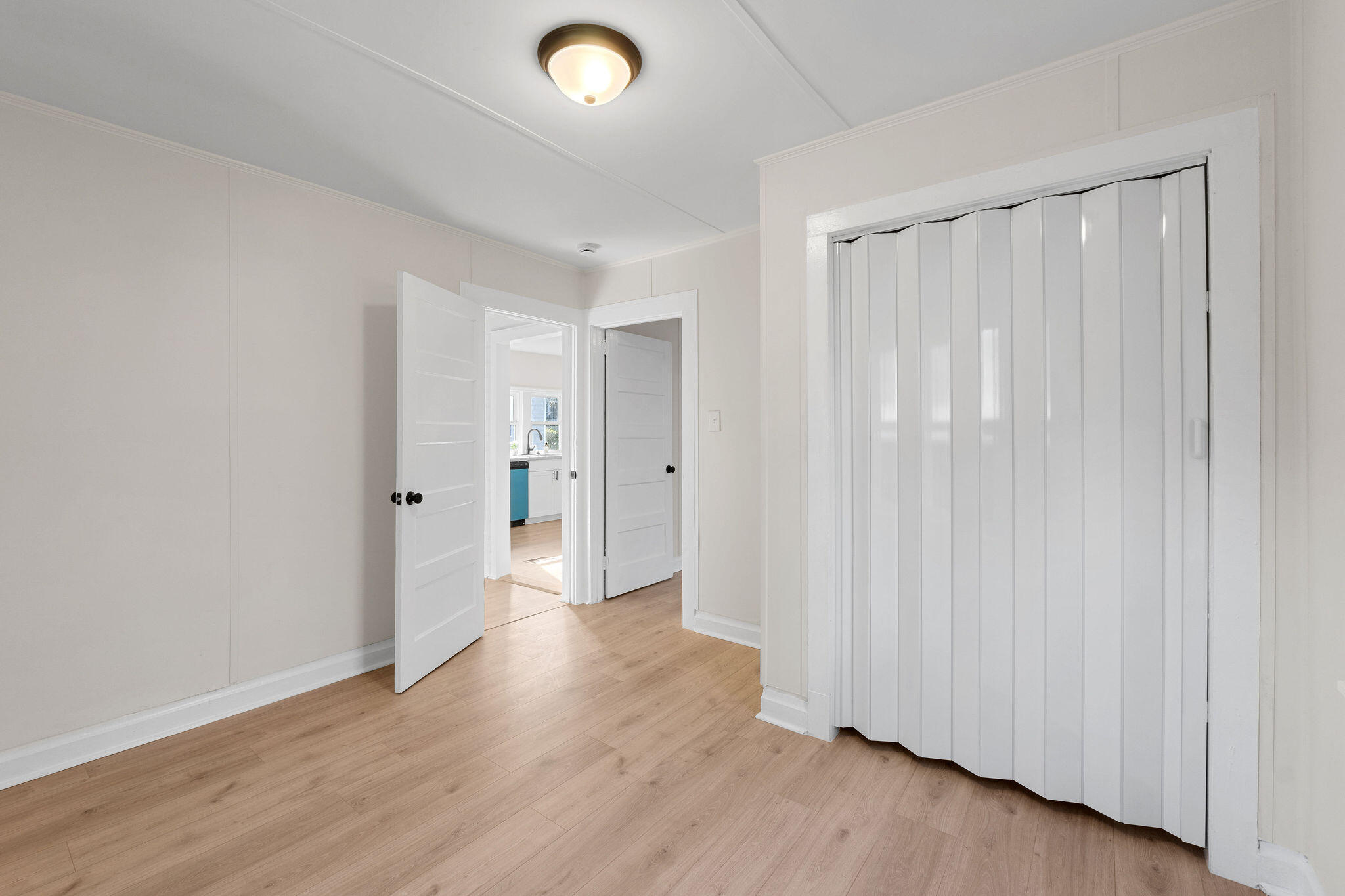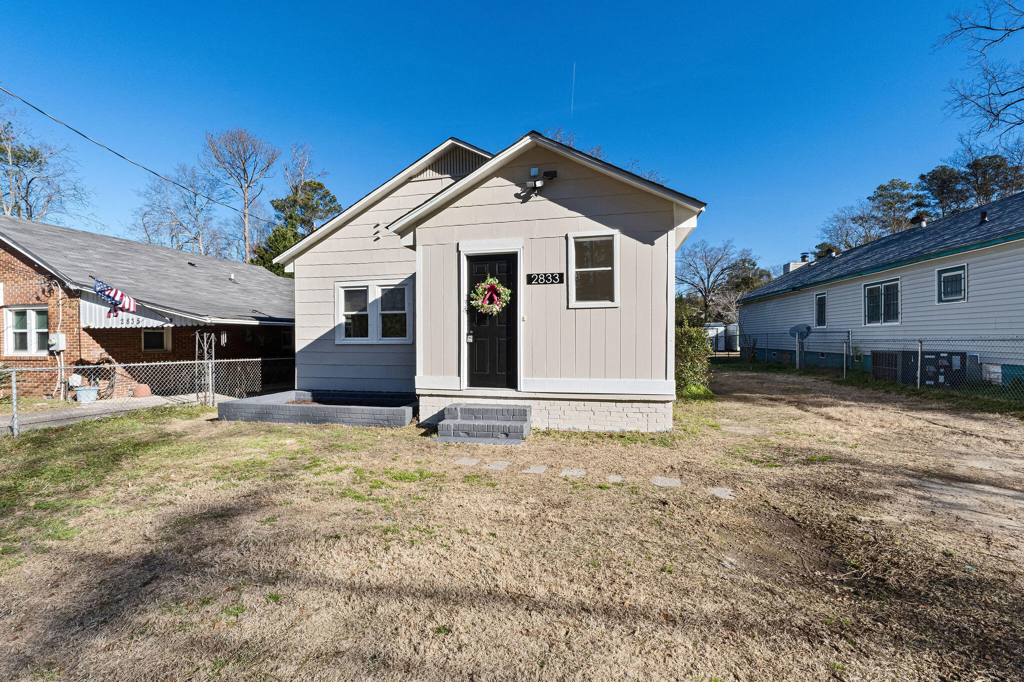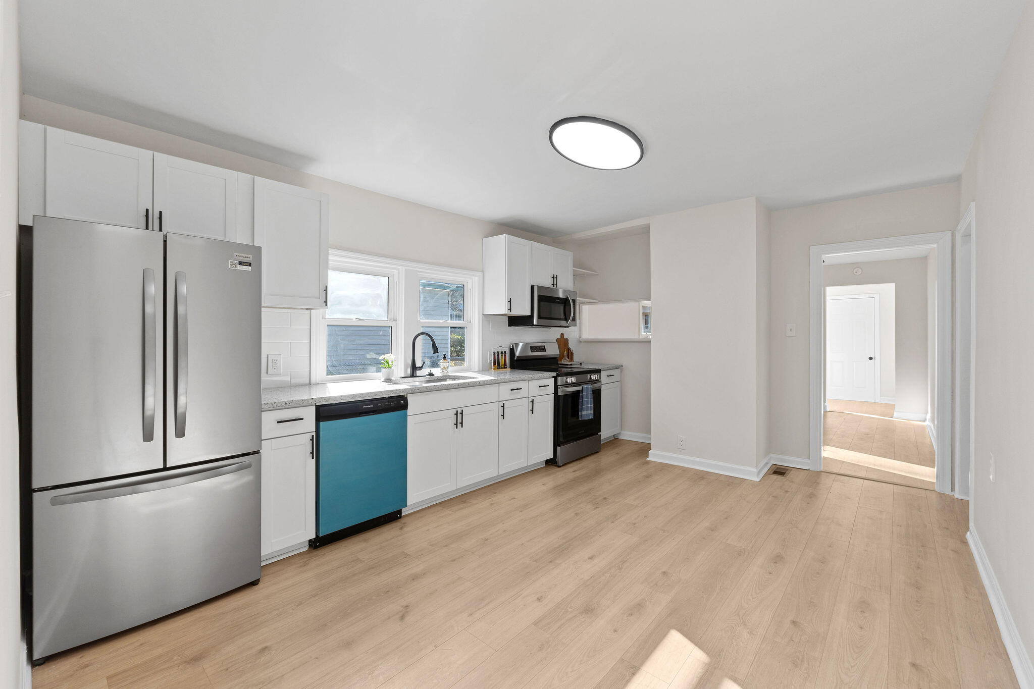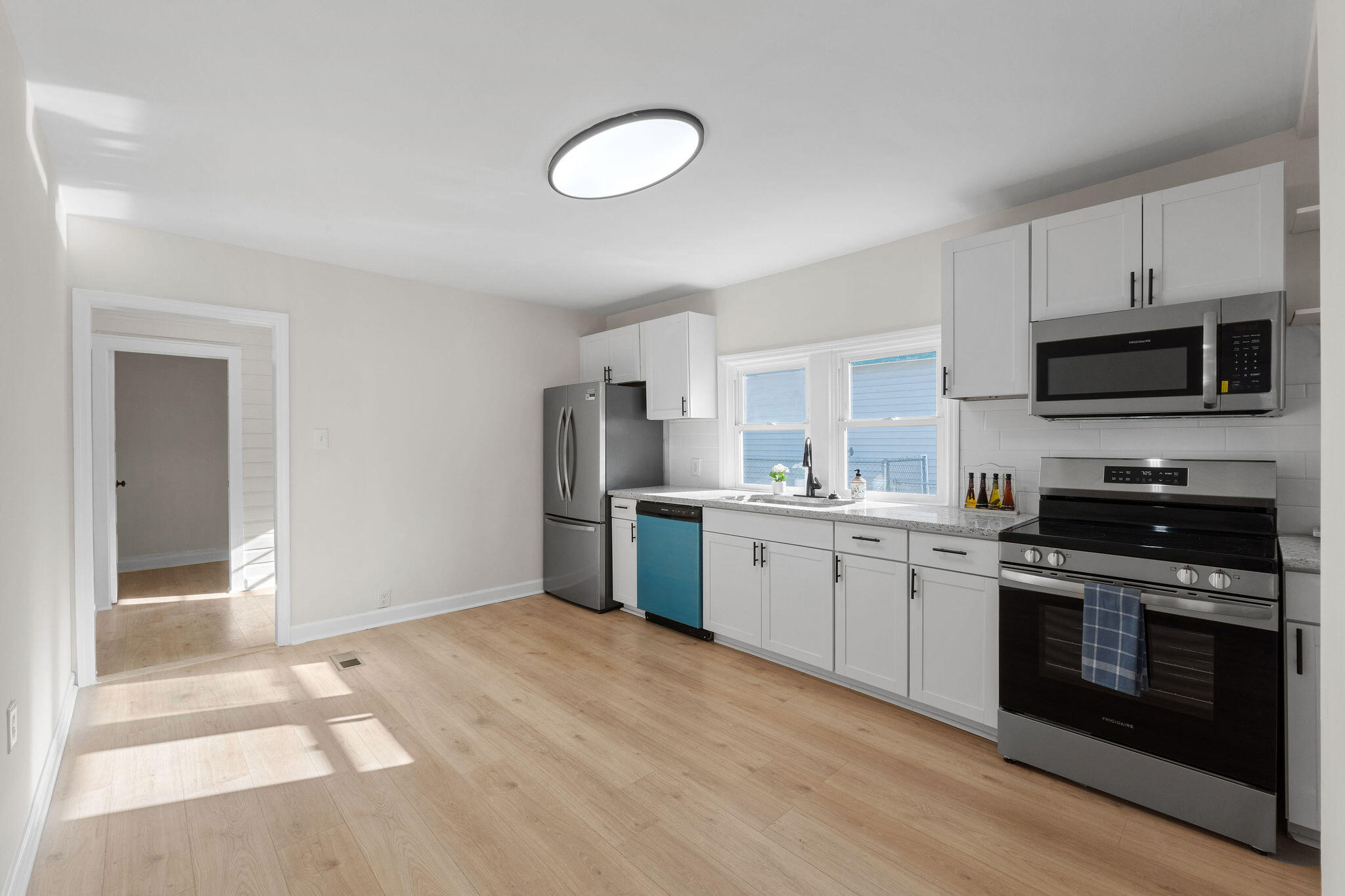 The home features 2 bedrooms, 1 bathroom, and a flex room great for a workspace, guest room, etc. The kitchen is updated with new cabinets, granite countertops, tile backsplash, and stainless appliances, plus fresh flooring and paint throughout.