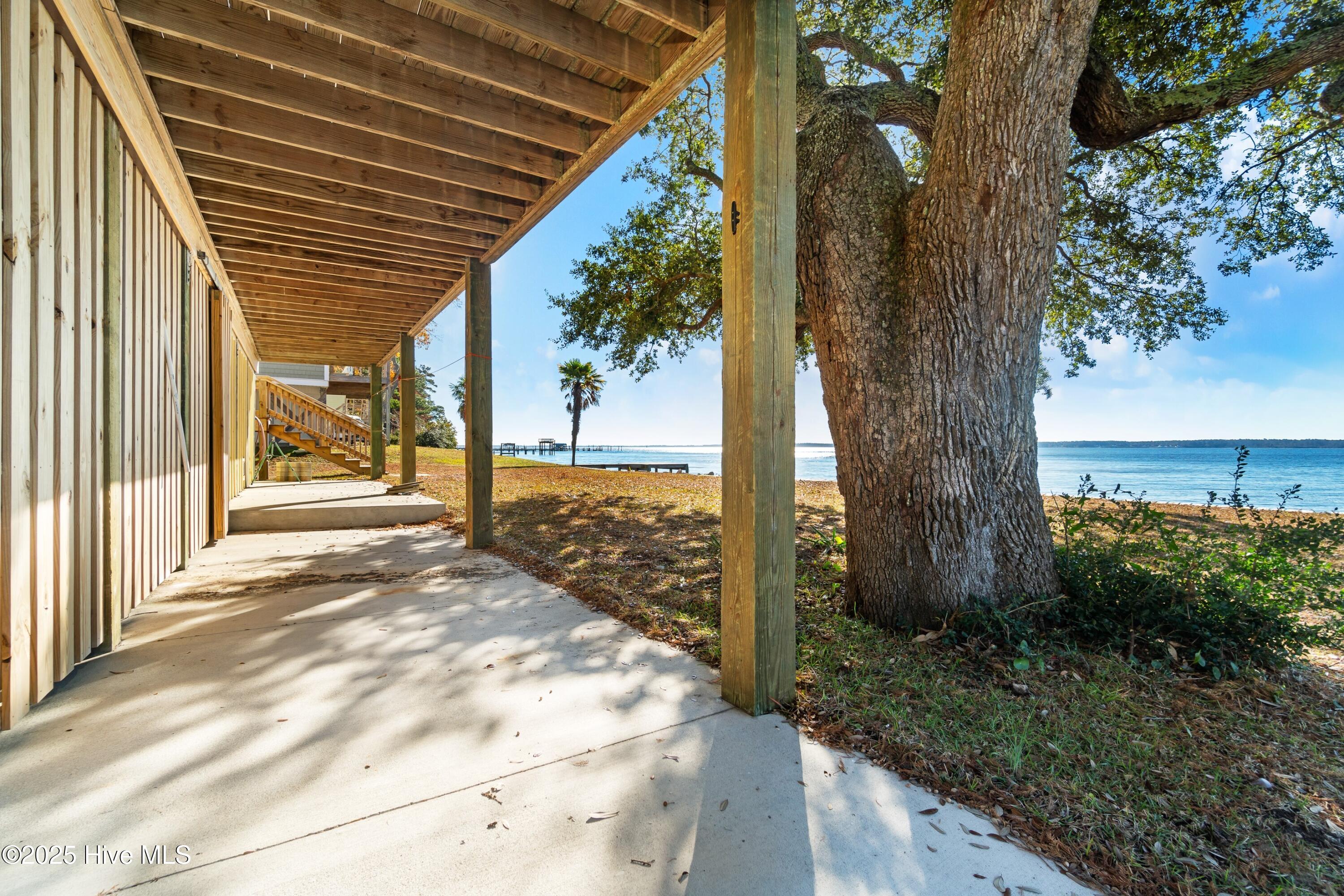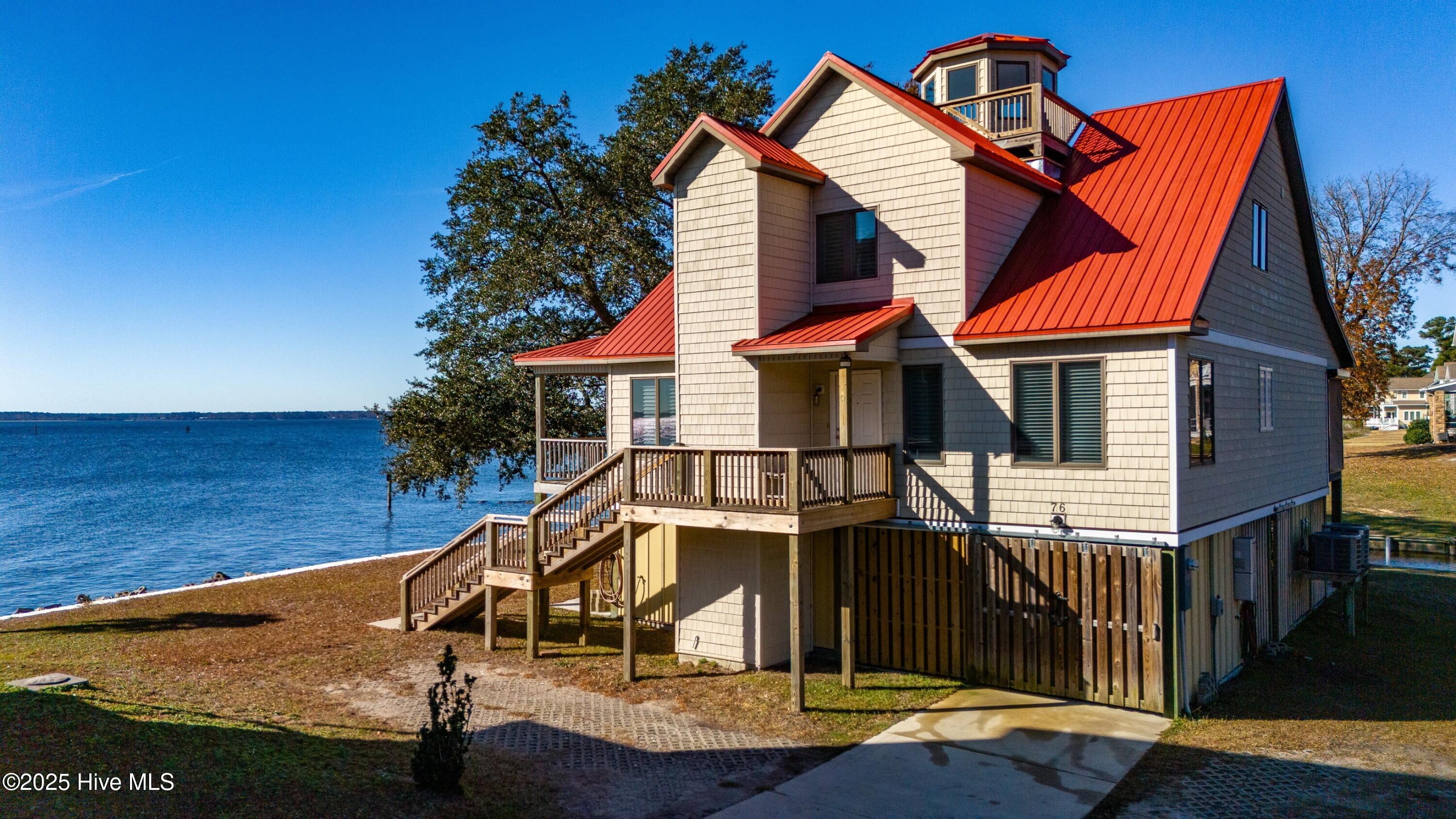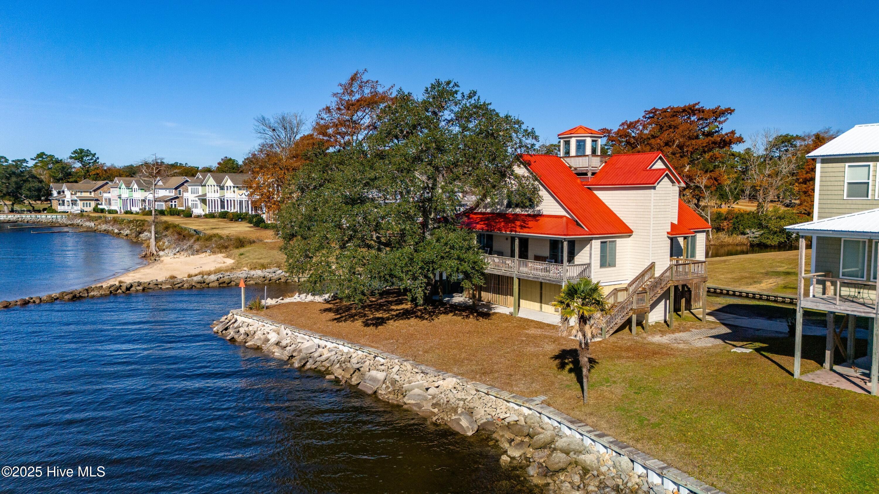 Enjoy iconic coastal living in this Neuse Riverfront home with its distinctive design inspired by the classic Inner Coastal screw-pile cottage-style lighthouses, including the celebrated New Canal Lighthouse on Lake Pontchartrain in New Orleans, Louisiana. Ideally located just a short stroll from the Minnesott Beach Golf & Country Club, minutes from the ferry, and close to Wayfarers Cove Marina, this three-bedroom, 2.5-bath residence blends architectural charm with modern comforts. Elevated on pilings with modular construction, the home features bamboo floors, plantation shutters, Anderson windows, and built-in bookcases that create a warm, character-rich interior. An elevator provides convenient access to all levels. The well-appointed kitchen includes quartz countertops, a JennAir 6-burner cooktop, built-in oven, microwave, refrigerator, dishwasher, and a stackable washer/dryer. Bathrooms include clean, easy-to-maintain walk-in showers. A striking spiral stairwell leads to an upper-level observation platform, offering elevated vistas of the Neuse River and surrounding coastal landscape. Outdoor living continues with a screened porch, open porch, extensive decking, a concrete patio, and a workshop. A two-car garage adds storage and convenience. A metal roof and air-to-air heat pump enhance durability and efficiency. Boaters will love the private boat basin complete with three slips and a 5,000-lb boat lift, providing direct access to the Neuse River. A serene private sandy beach completes this exceptional riverfront setting. A distinctive coastal retreat that beautifully blends lighthouse-inspired architecture with superb waterfront amenities.