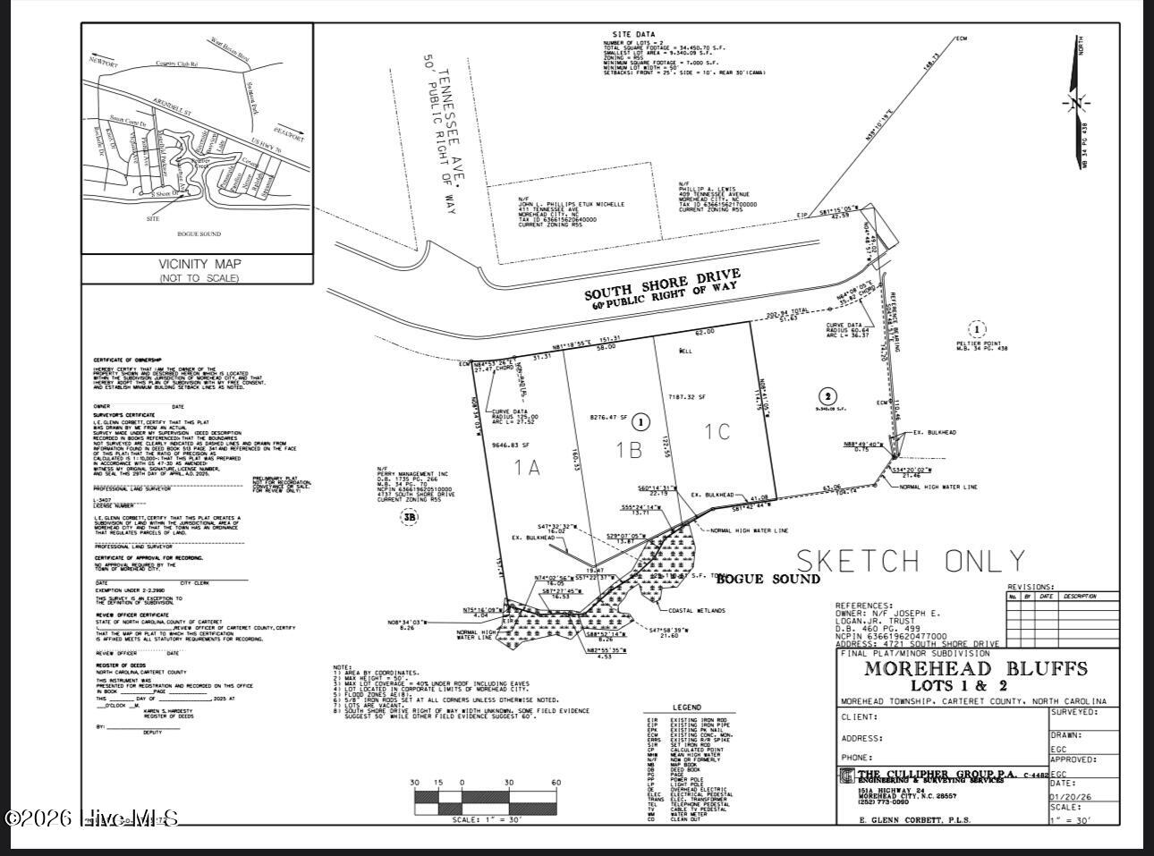 Currently one of three potential lots located at 4729 S. Shore Drive. Ron Cullipher of The Cullipher Group has completed an engineered plan to subdivide, creating this lot and two others. The full parcel (over 200′ on Bogue Sound) is also available. Subdivision would need to completed prior to closing on any of the three individual lot offerings. S. Shore offers an incredible neighborhood setting, existing bulkhead and a site (or sites) that are cleared for building you ideal soundfront home. Ideally located just minutes from marinas, dining & shopping and a short drive to nearby beaches. Please see estimates already obtained for adding a dock and boatlift, as well as MLS listings for the other two potential lots (MLS# 100564566 & 100564567) as well as the entire parcel (MLS# 100564565.