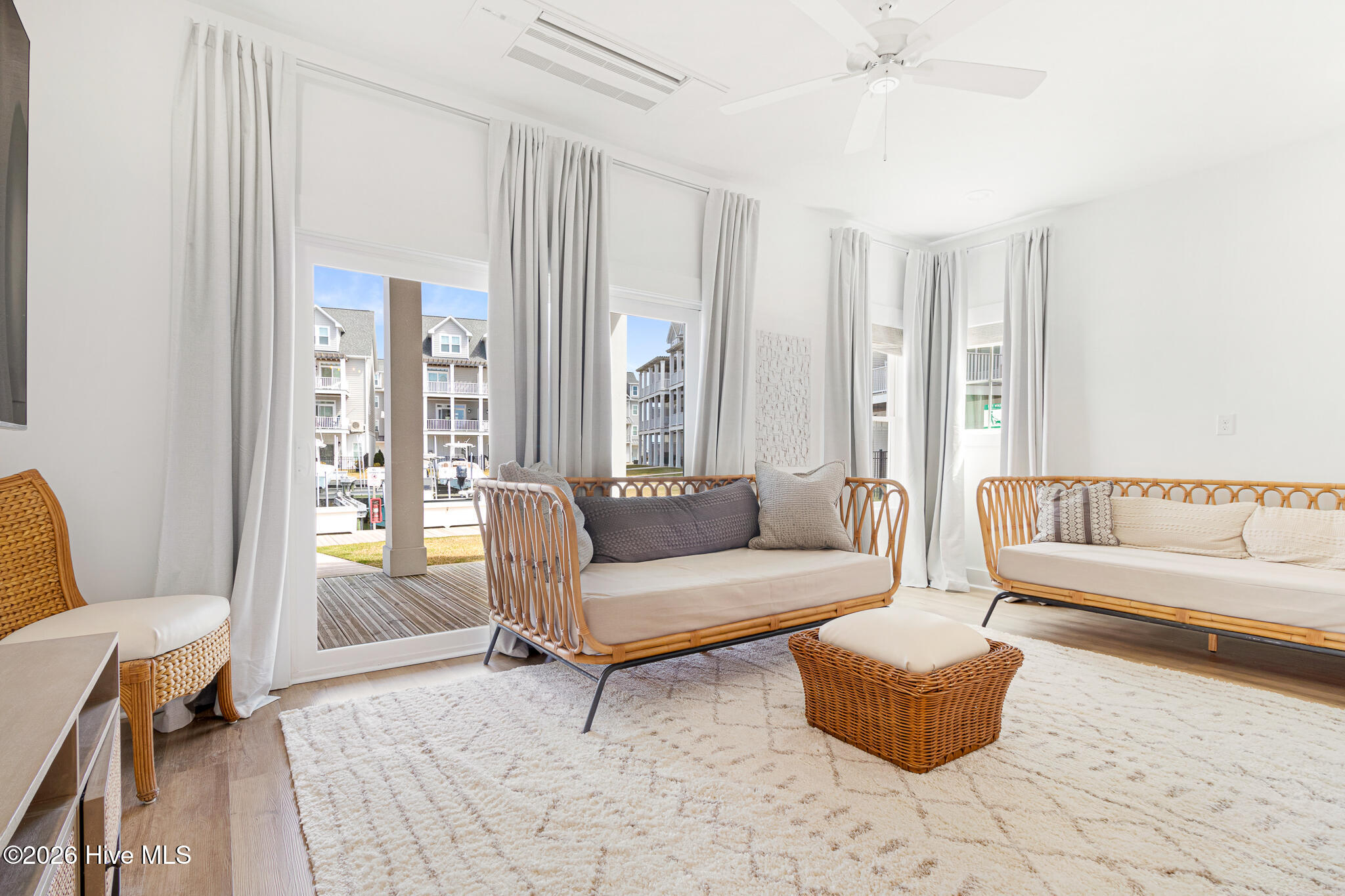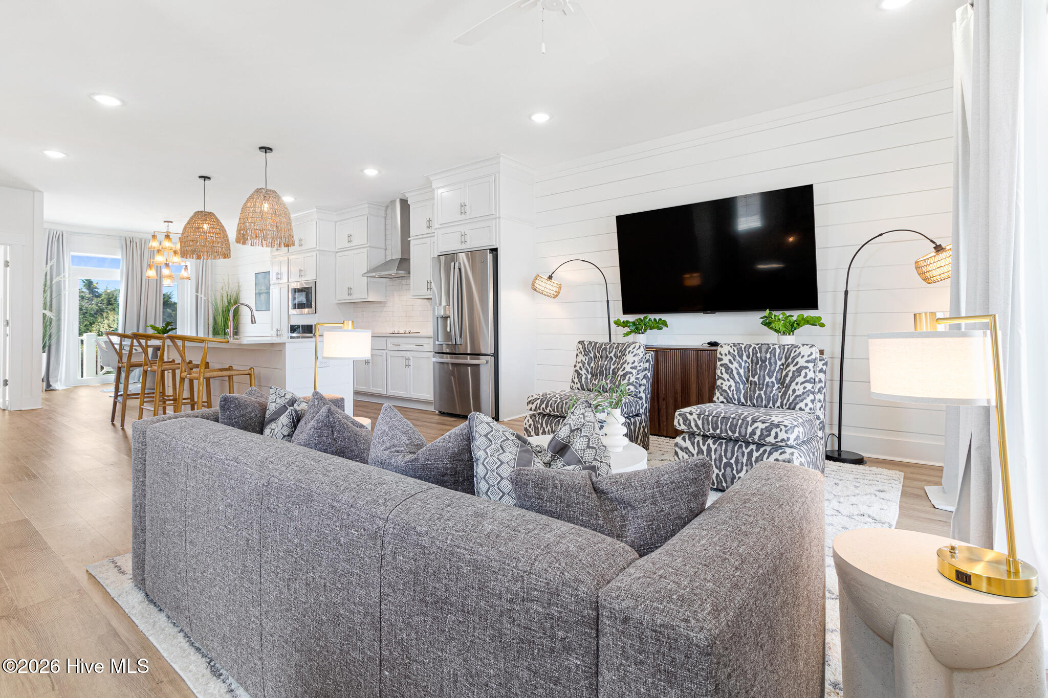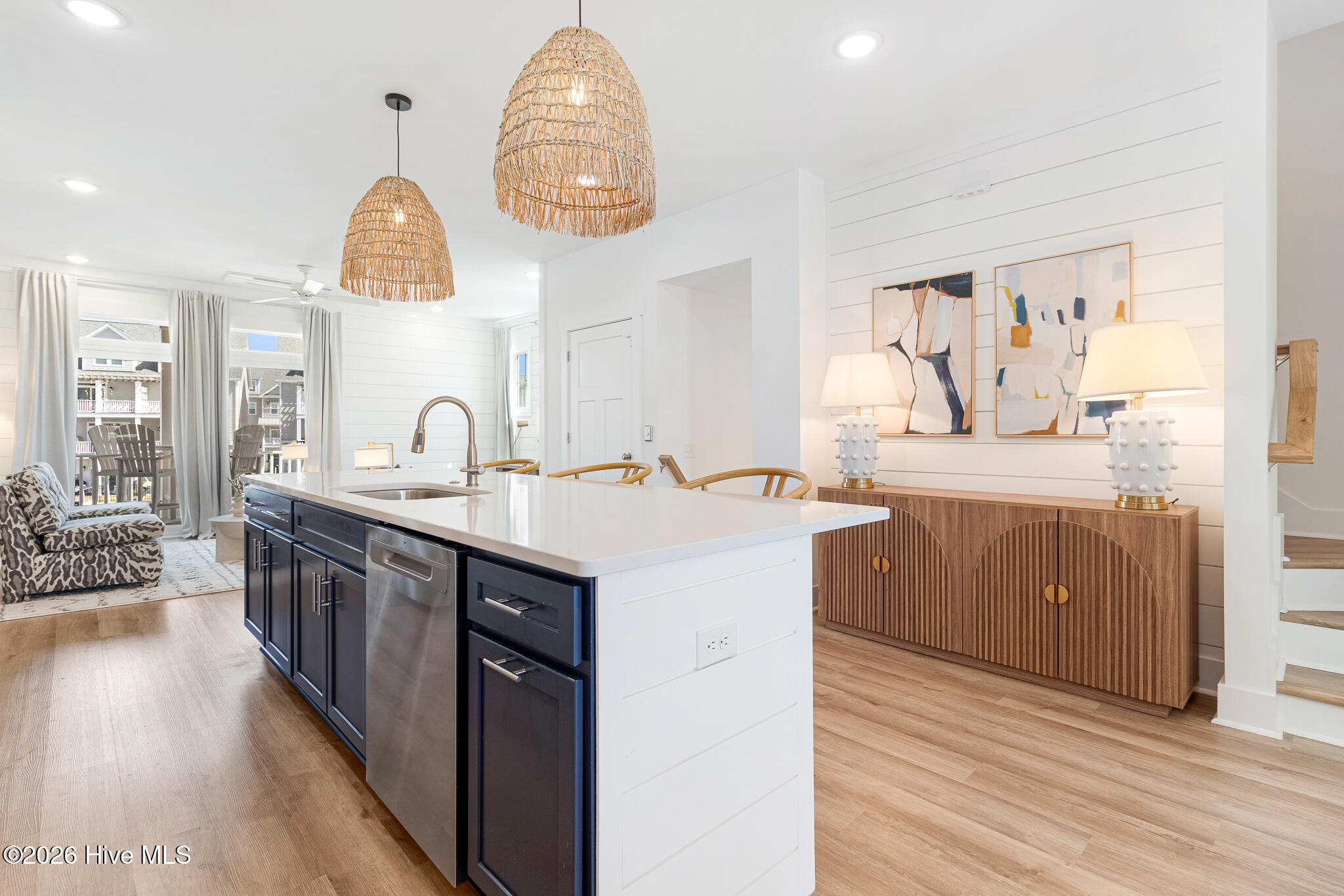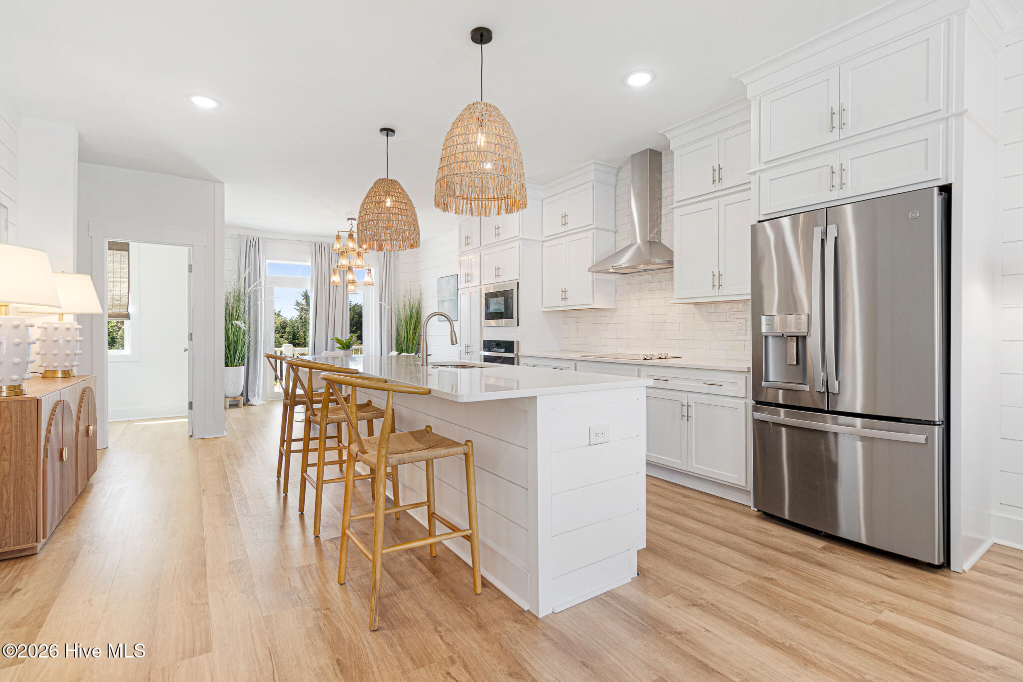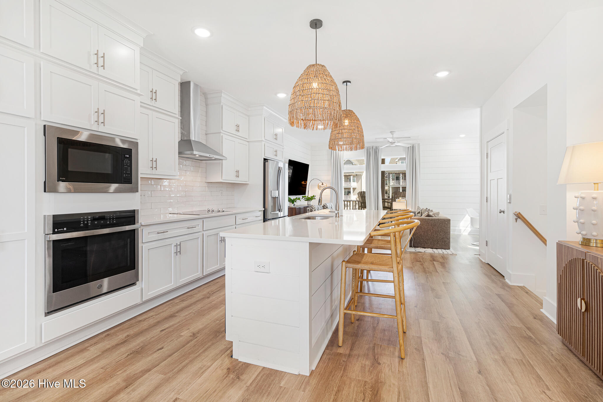 The second floor showcases a bright and airy main living space with coastal-inspired upgraded shiplap walls and kitchen island details, upgraded custom cabinetry, and a gourmet kitchen complete with white-toned cabinetry, quartz countertops, a sleek backsplash, and stainless steel appliances. Abundant natural light pours in through extra windows, highlighting the panoramic water views. The living area opens to a marina-front deck–perfect for morning coffee and a private dining area ideal for entertaining.