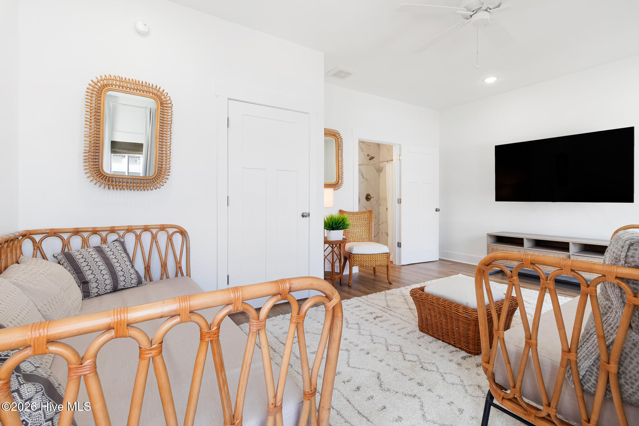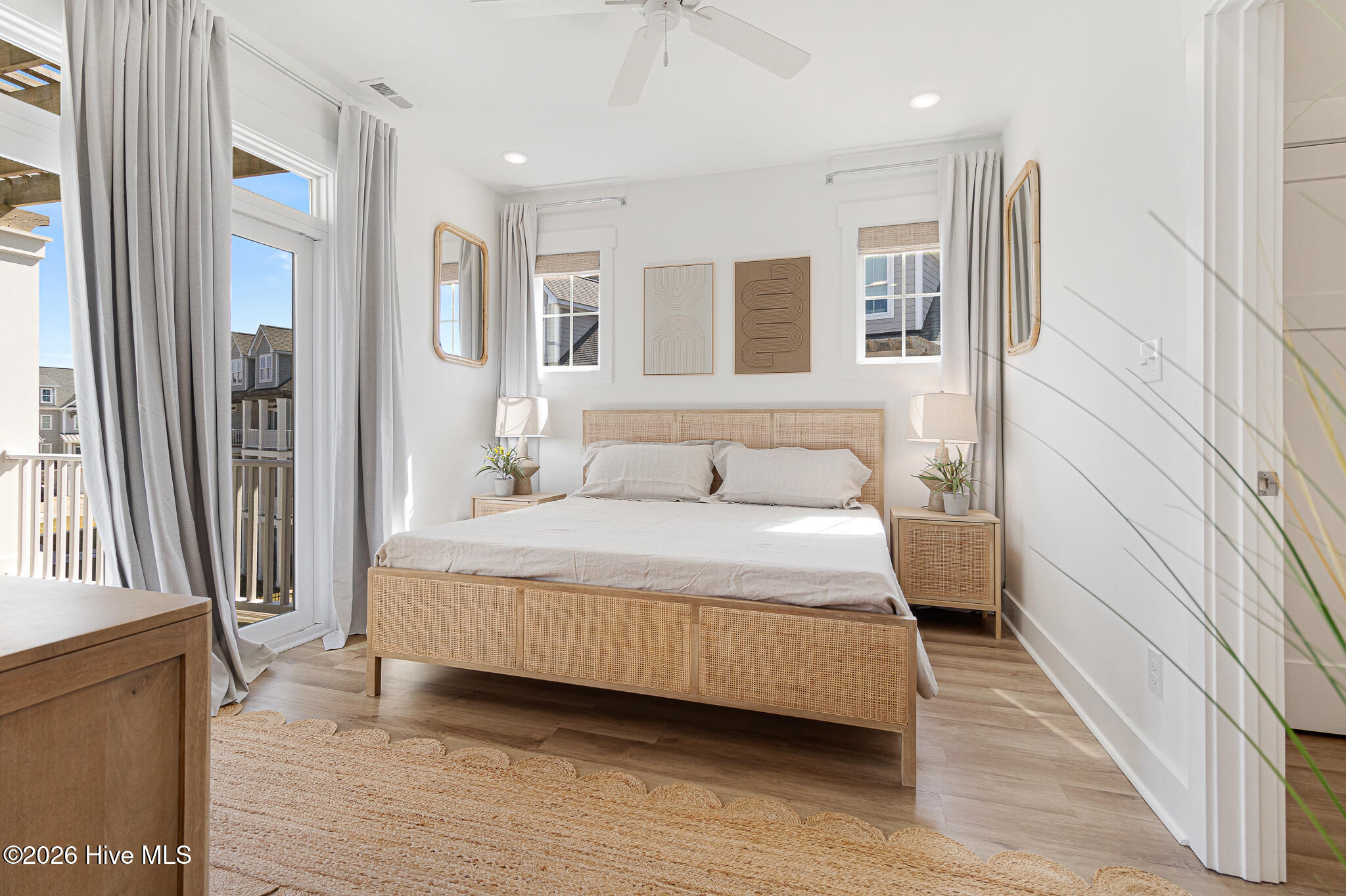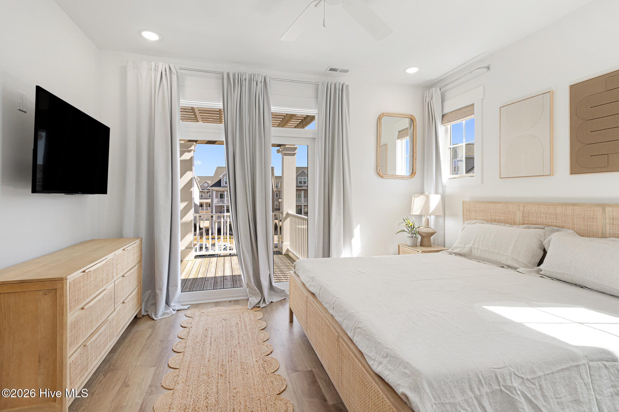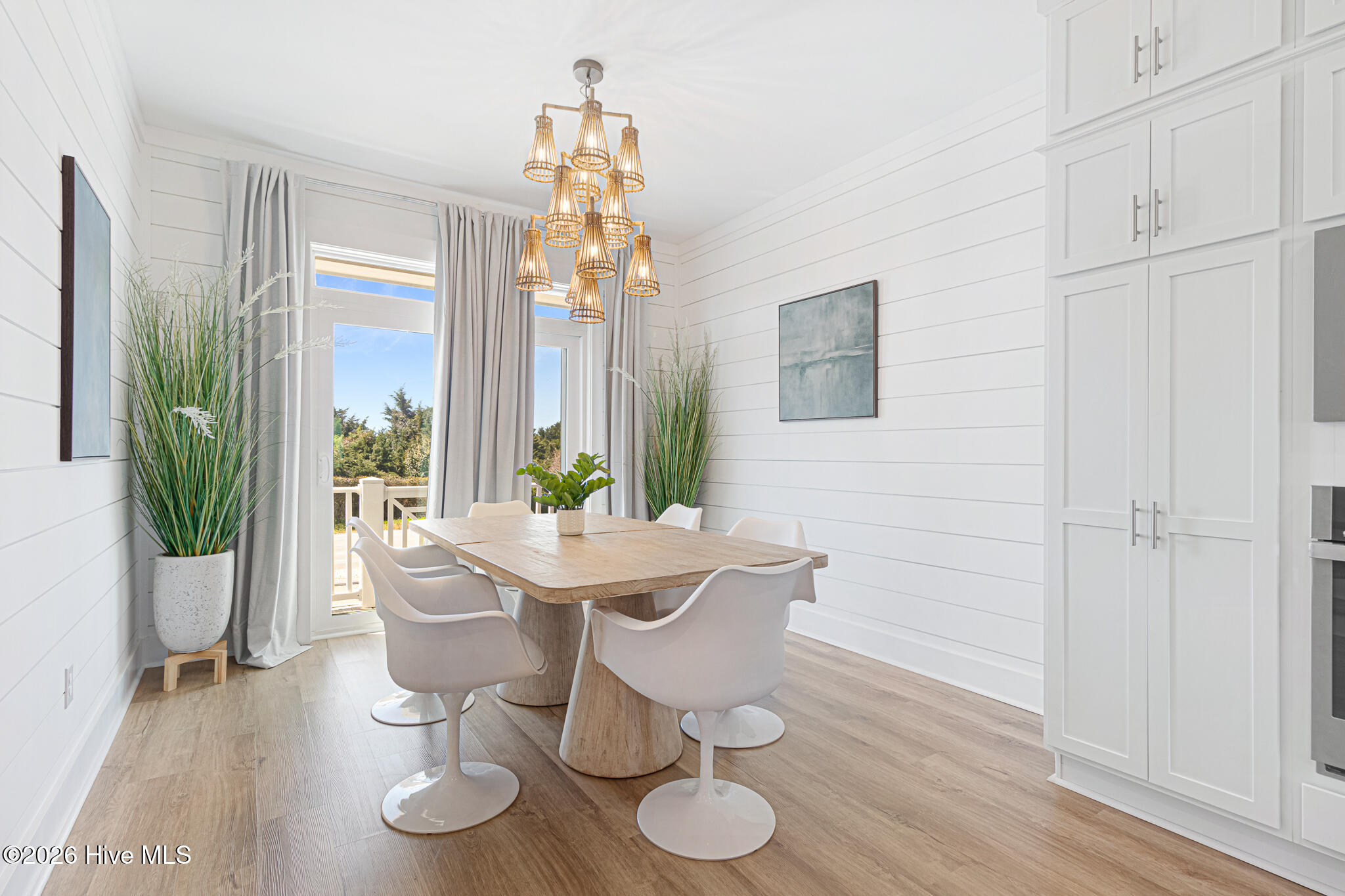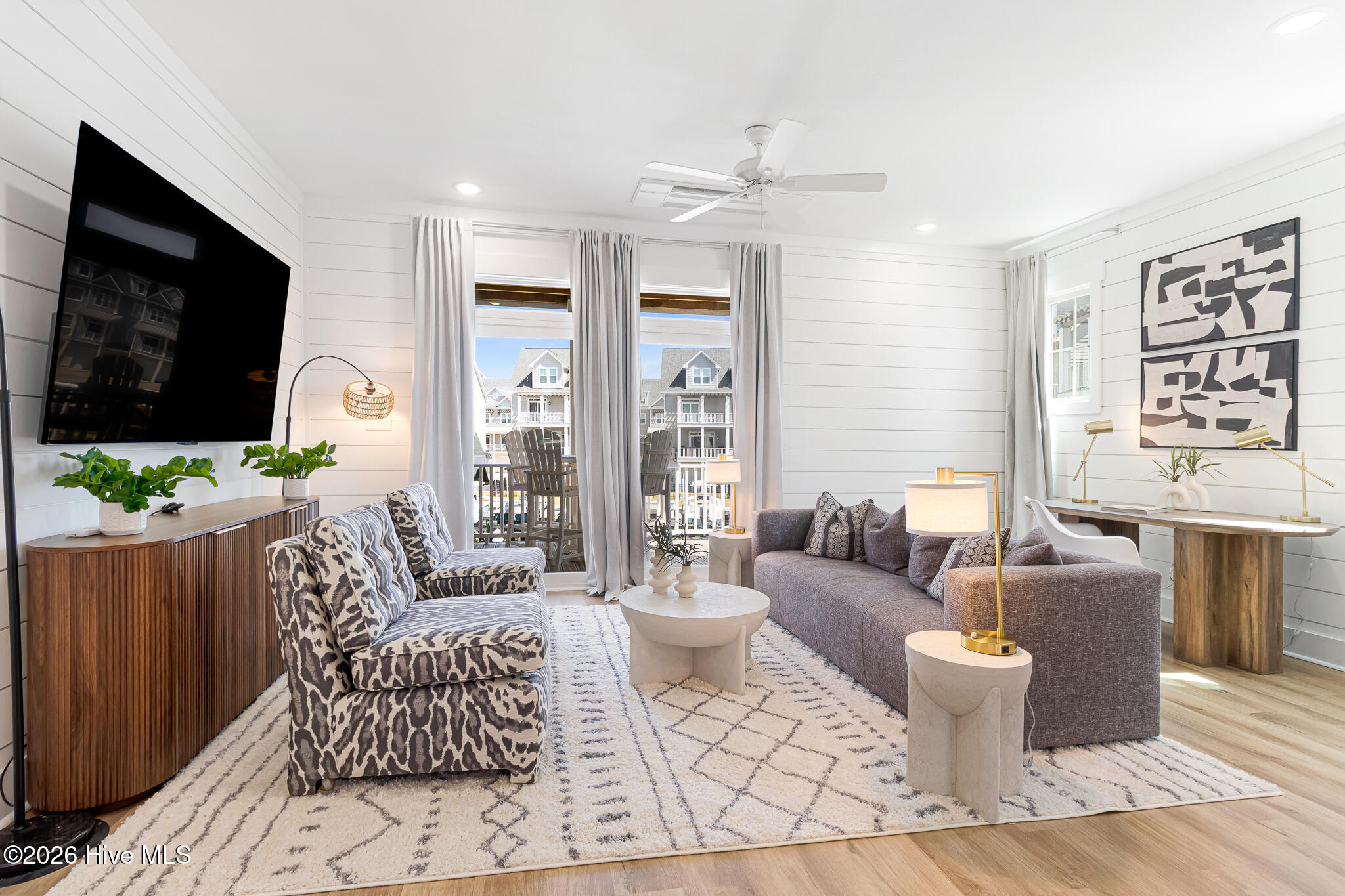 The second floor showcases a bright and airy main living space with coastal-inspired upgraded shiplap walls and kitchen island details, upgraded custom cabinetry, and a gourmet kitchen complete with white-toned cabinetry, quartz countertops, a sleek backsplash, and stainless steel appliances. Abundant natural light pours in through extra windows, highlighting the panoramic water views. The living area opens to a marina-front deck–perfect for morning coffee and a private dining area ideal for entertaining.