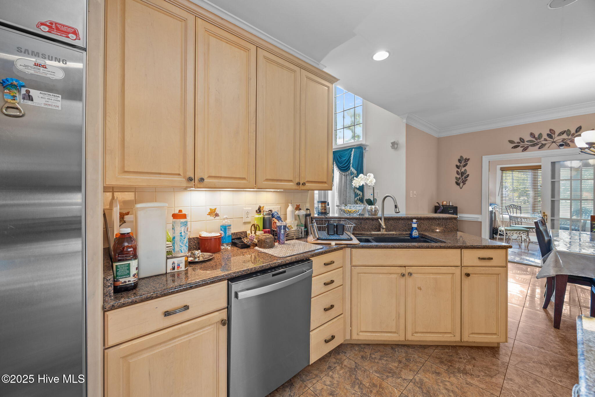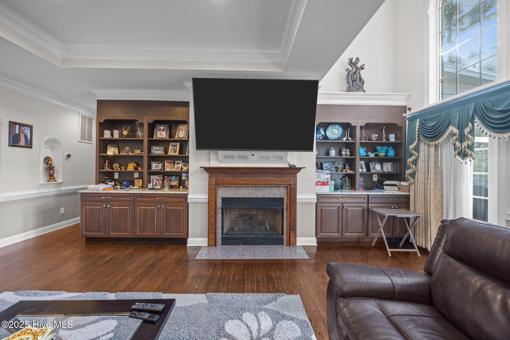 Step through the impressive entryway into a grand foyer with sweeping staircase and sunlit spaces adorned with oversized windows, voluminous ceilings, intricate moldings, and hearty wood flooring. The living and formal dining rooms feature floor to ceiling custom cabinetry and shelving. Mingle with guests amongst the tailored trey ceiling centered around granite adorned gas fireplace, creating a refined ambiance.
