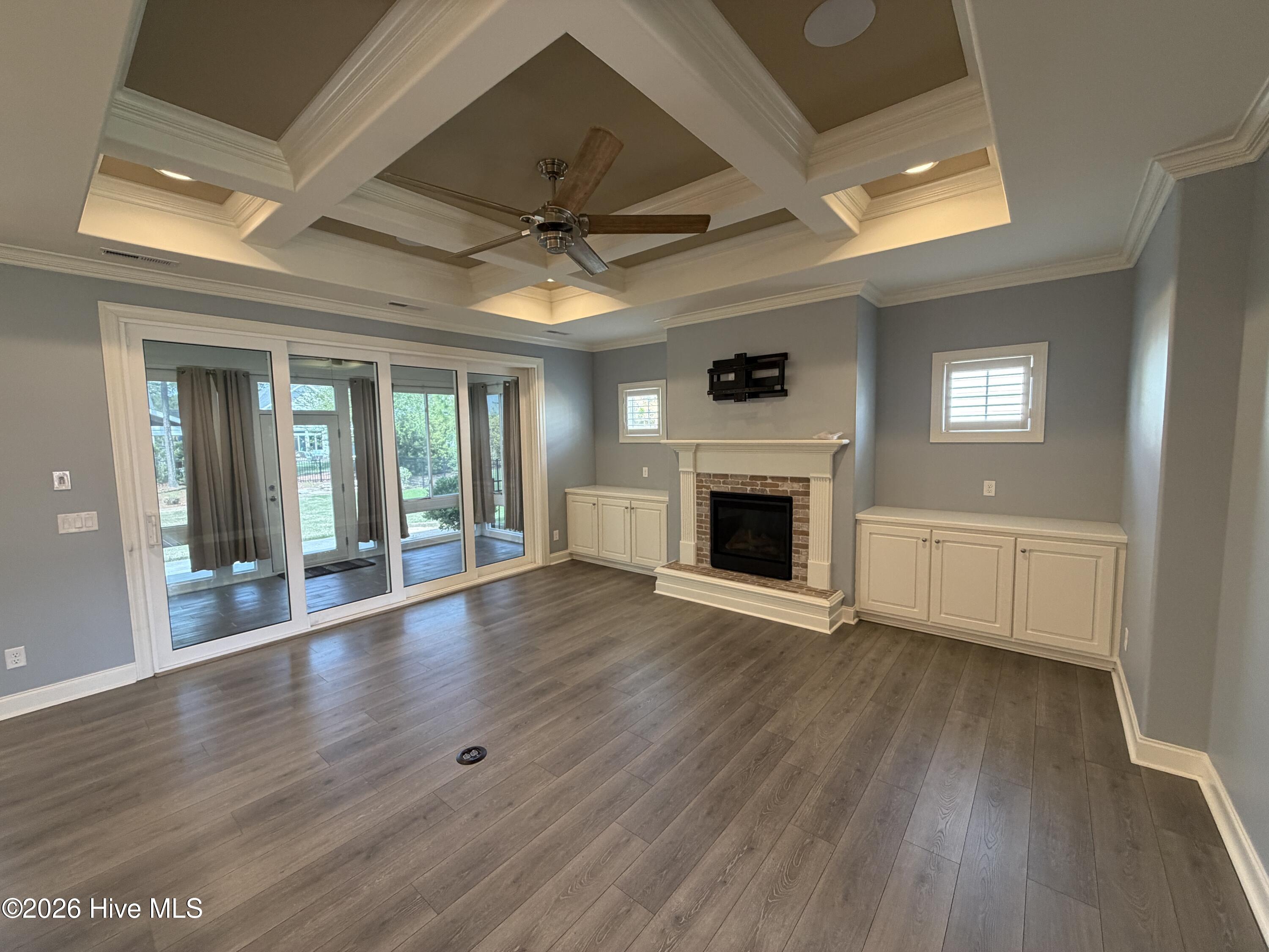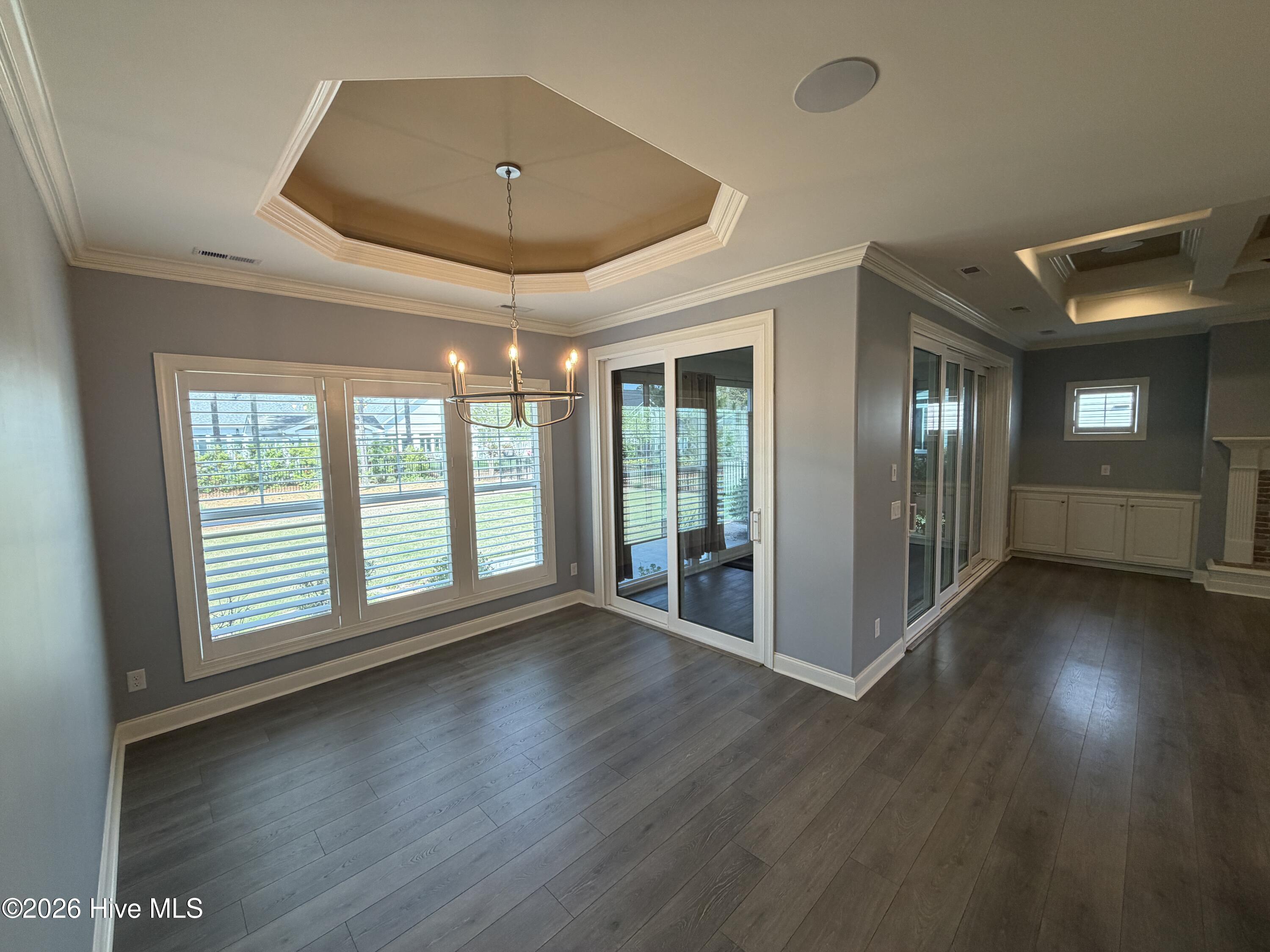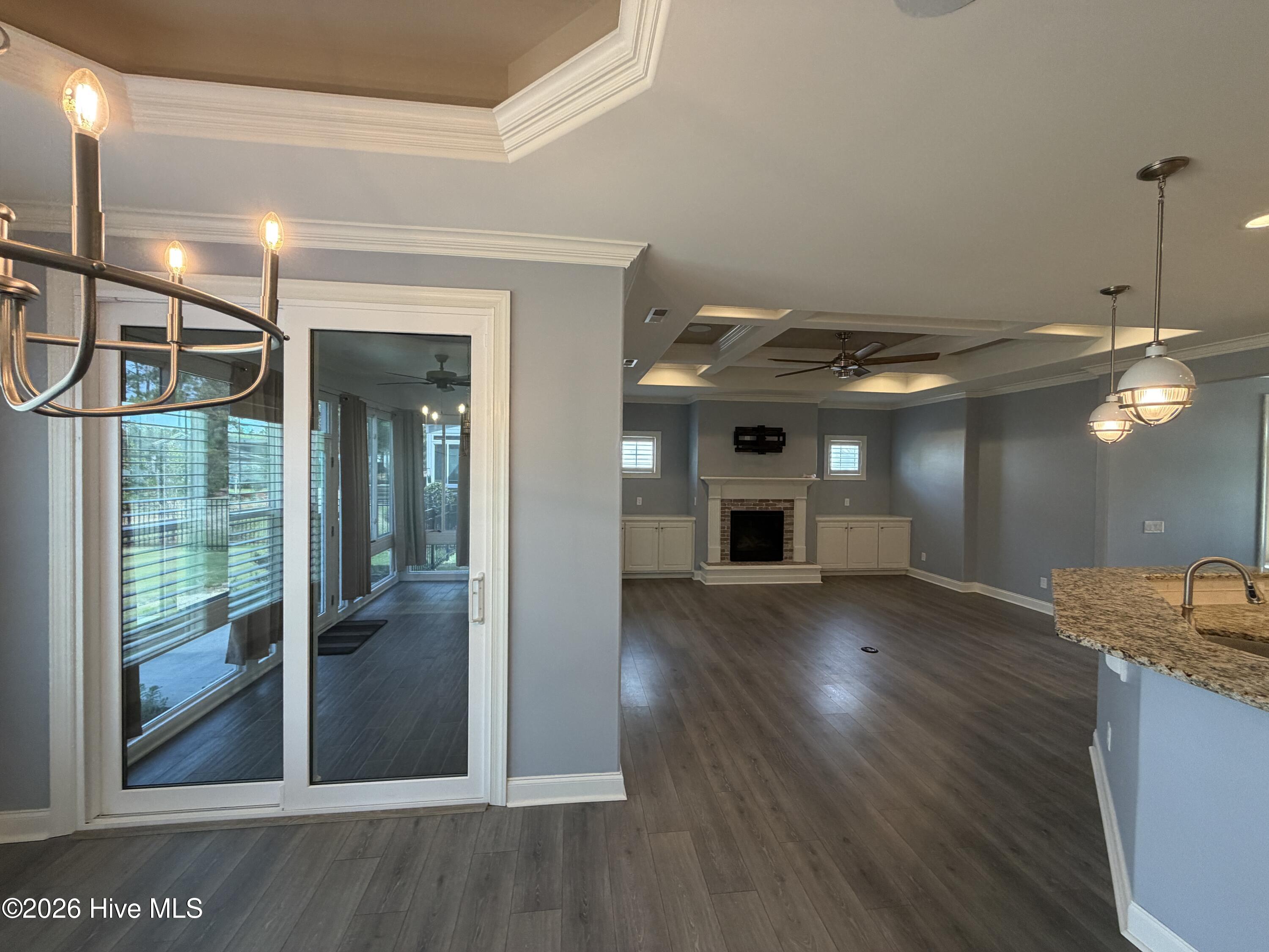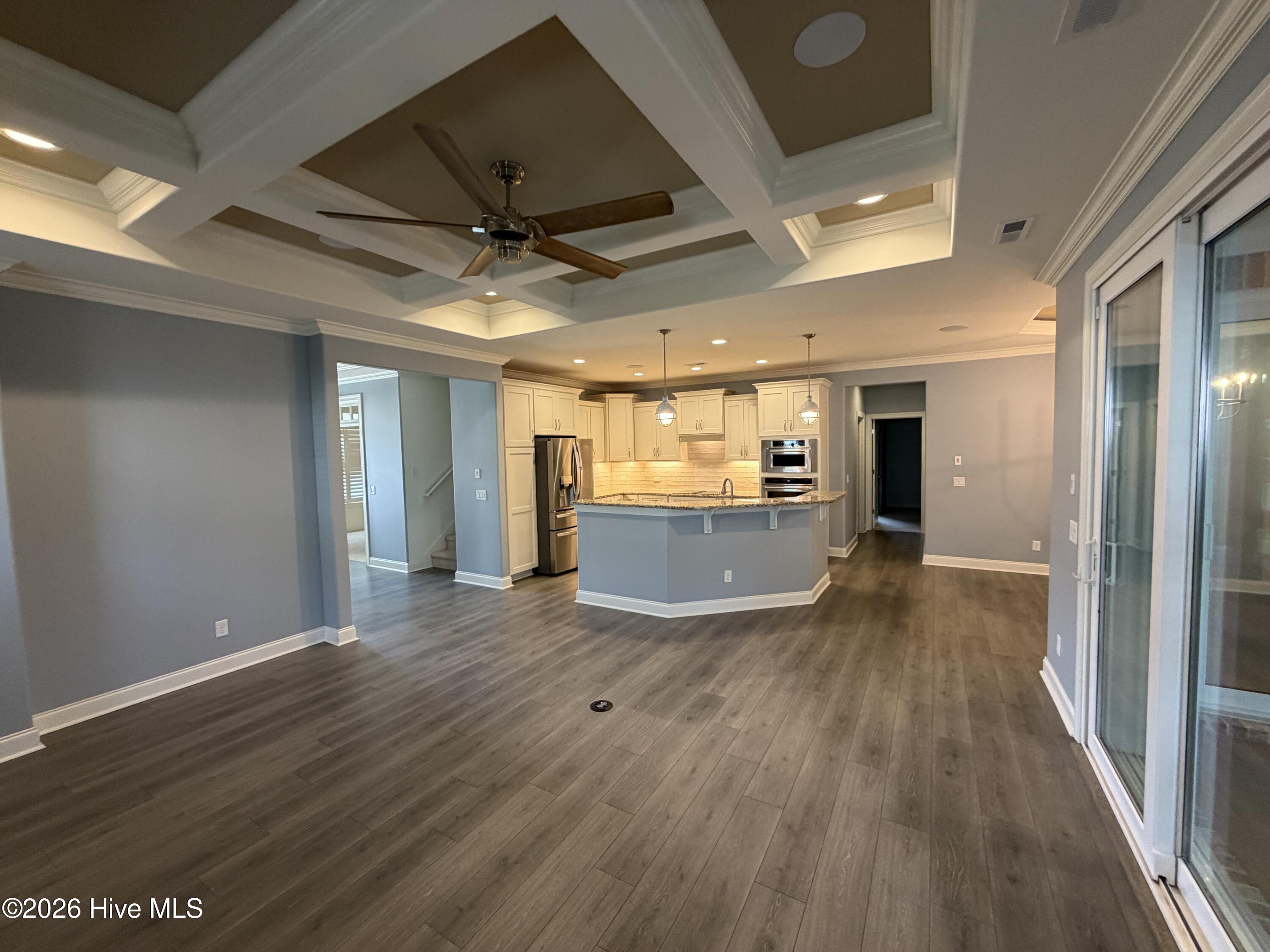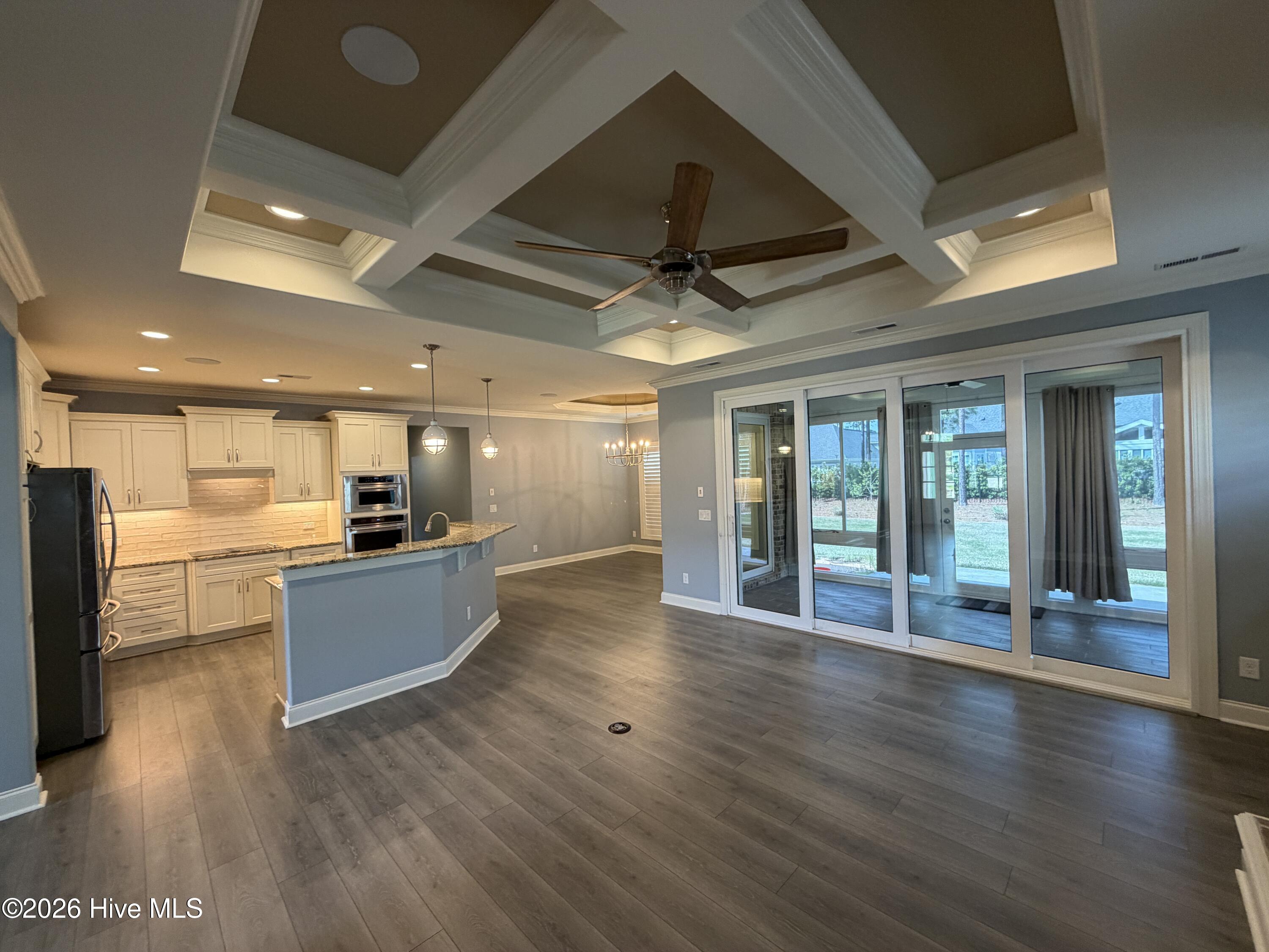 The open-concept layout showcases crown molding, tray ceilings, rounded drywall corners, and ceiling fans, flowing seamlessly into the dining area and upgraded kitchen. The kitchen is equipped with KitchenAid appliances, solid-surface countertops, an oversized island, abundant cabinetry, and a new LG refrigerator (2023)—ideal for entertaining and everyday living. A first-floor audio system, Honeywell Home alarm, and three professionally installed TV mounts add convenience and comfort.