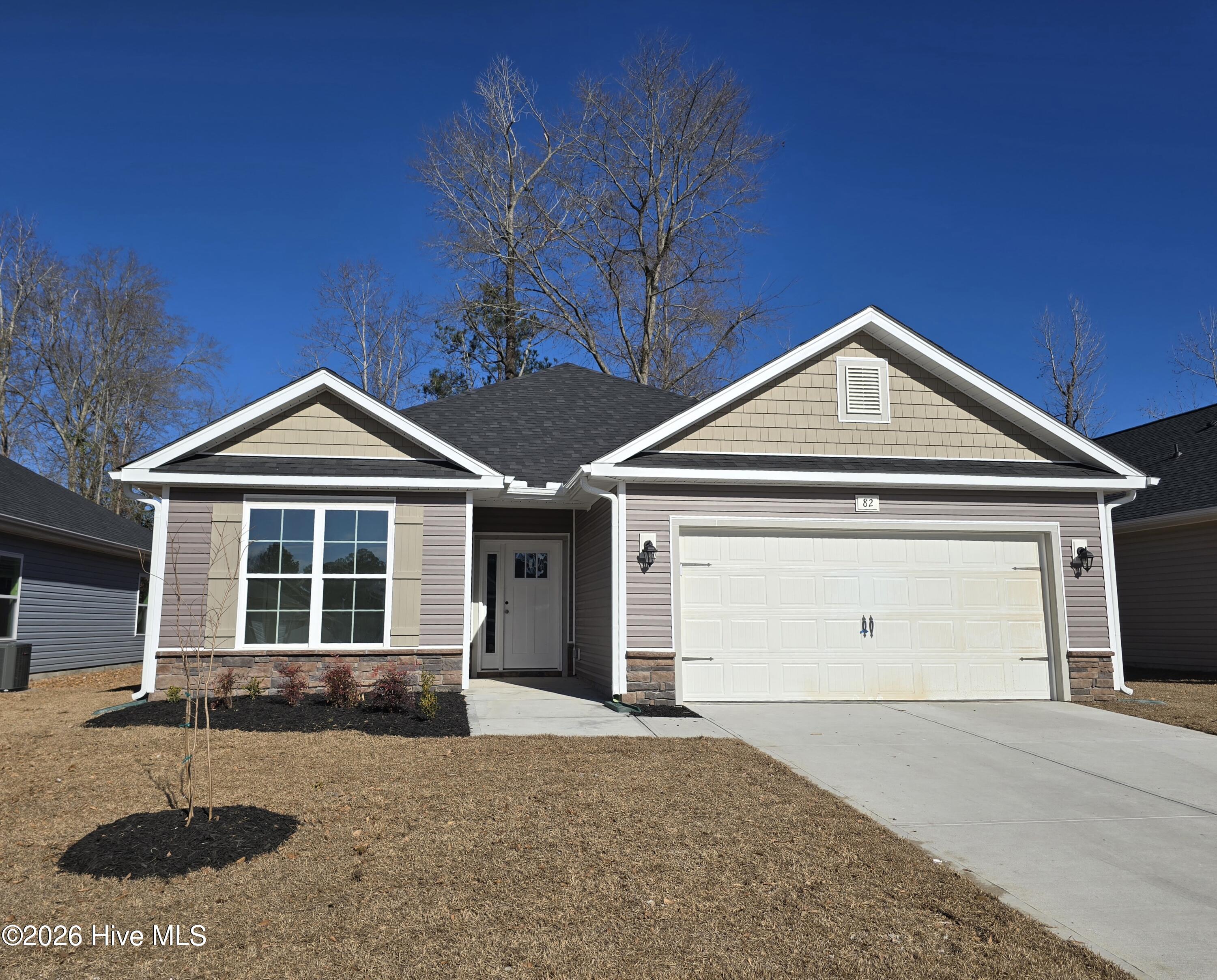 Welcome to your new dream home to be constructed at 82 Fishing Creek Drive in the picturesque Belle Oaks neighborhood of New Bern, NC. This brand-new construction offers 1,634 square feet of thoughtfully designed living space, featuring three generously sized bedrooms and two elegant bathrooms. The heart of the home is a spacious kitchen that boasts ample storage, stainless steel appliances, and beautiful granite countertops, seamlessly flowing into a spacious breakfast nook. The open-concept living area is enhanced by vaulted ceilings in the living room, kitchen, and dining spaces, complemented by an inviting electric fireplace. The master bedroom is a retreat of its own with luxurious tray ceilings, while the master bathroom impresses with a tiled shower and a relaxing garden tub. Additional upgrades include sleek quartz counter-tops in the bathrooms. You will also be happy to find that you have a separate laundry room with washer and dryer hook-up. Enjoy outdoor living on the covered lanai, perfect for relaxing or entertaining in style. Conveniently located, this home is just a short drive from downtown New Bern, where you’ll find a variety of dining options and vibrant activities. Additionally, you’re within easy reach of essential amenities such as hospitals and shopping centers, ensuring a perfect blend of comfort and convenience.