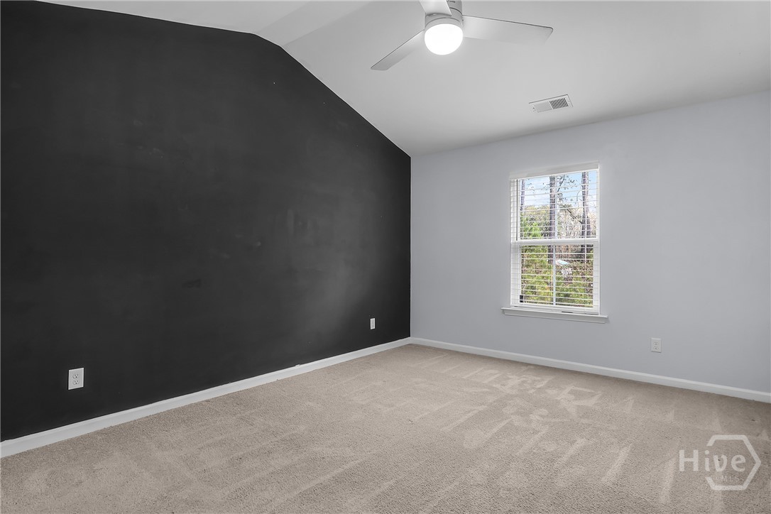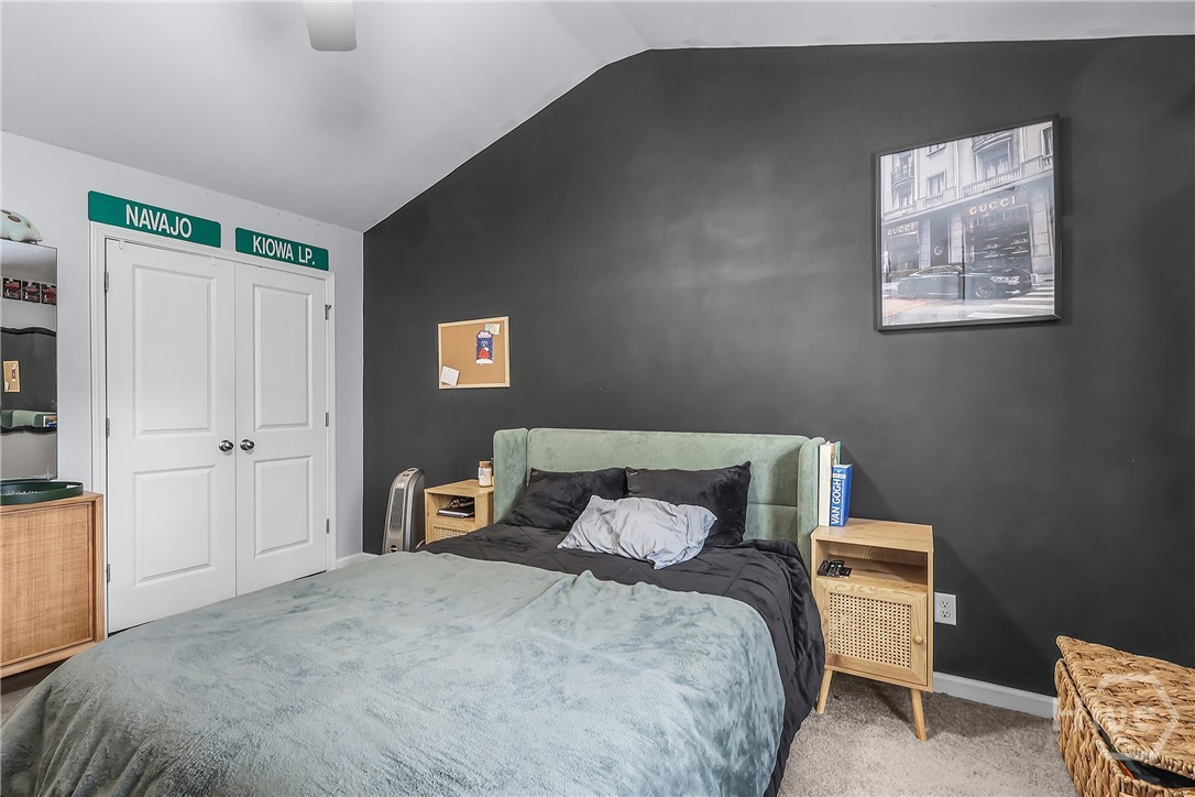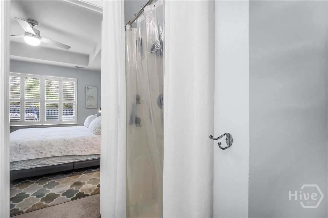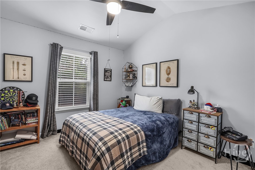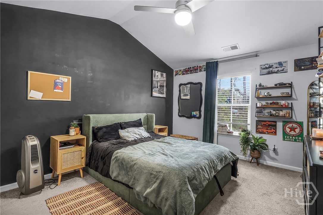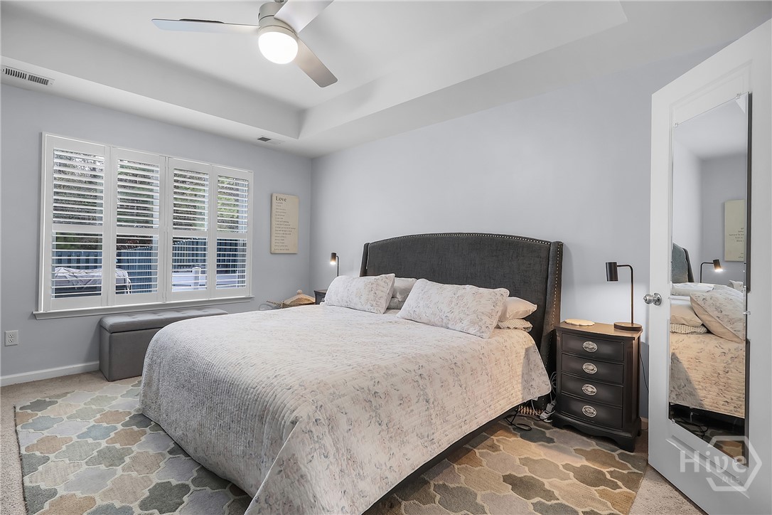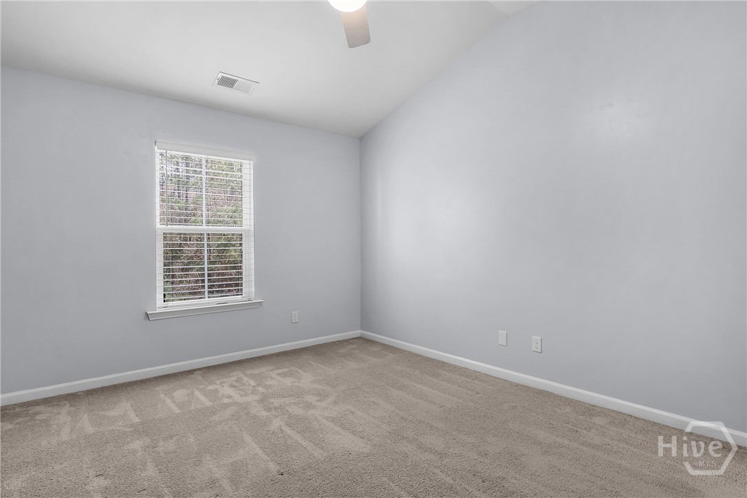 The primary suite provides a relaxing retreat with vaulted ceilings, plantation shutters, and ample space for a king-size bed and additional furnishings. Additional bedrooms are generously sized and versatile, suitable for guests, a home office, or hobbies. Bathrooms are well maintained with modern fixtures and finishes. A dedicated laundry area offers added convenience and storage.