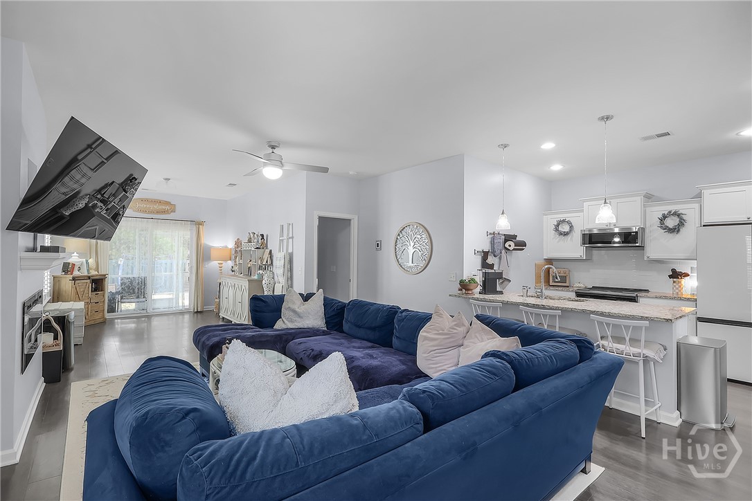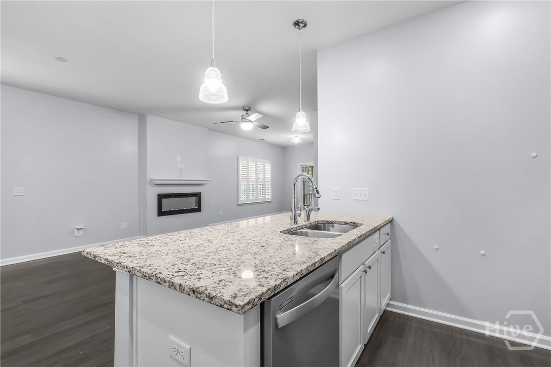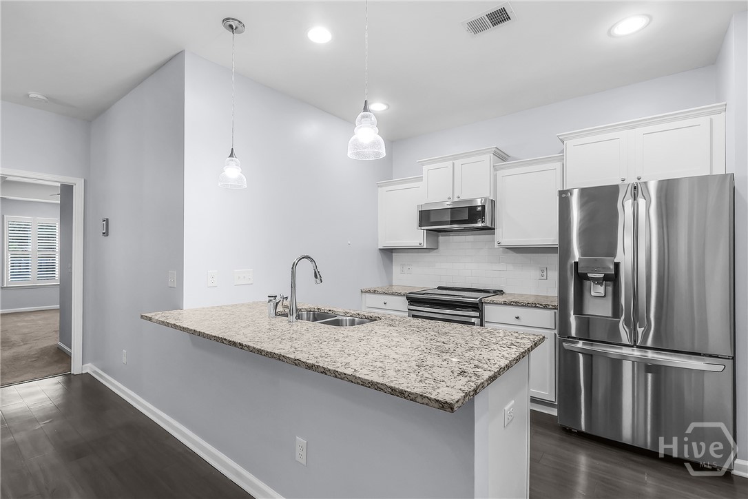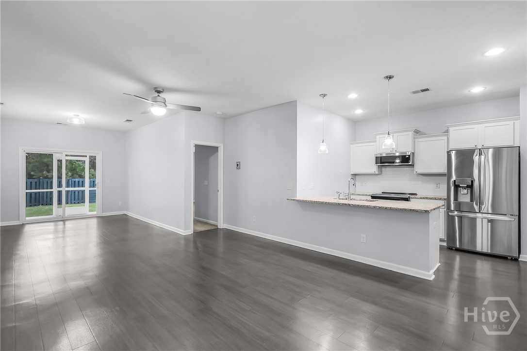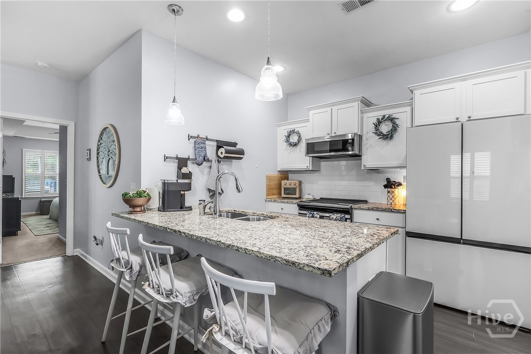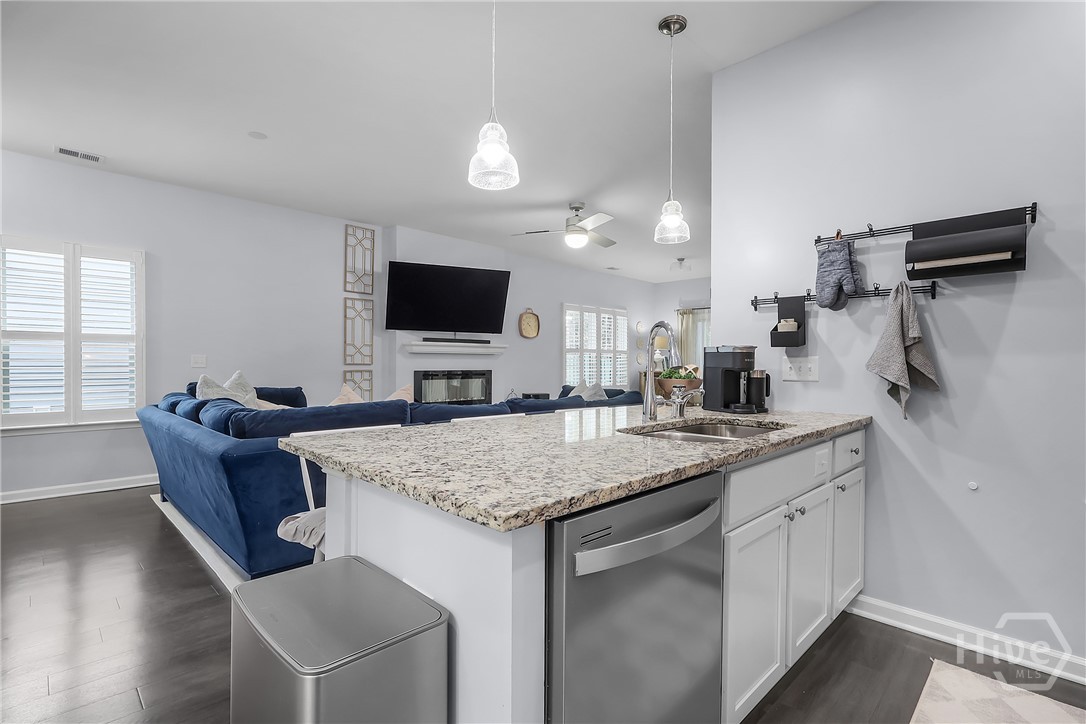 The kitchen is a true focal point, featuring granite countertops, a large island with bar seating, stainless-steel appliances, white cabinetry, subway tile backsplash, pendant lighting, and a deep double sink. The island overlooks the living space, making it ideal for gatherings, casual meals, and everyday use.