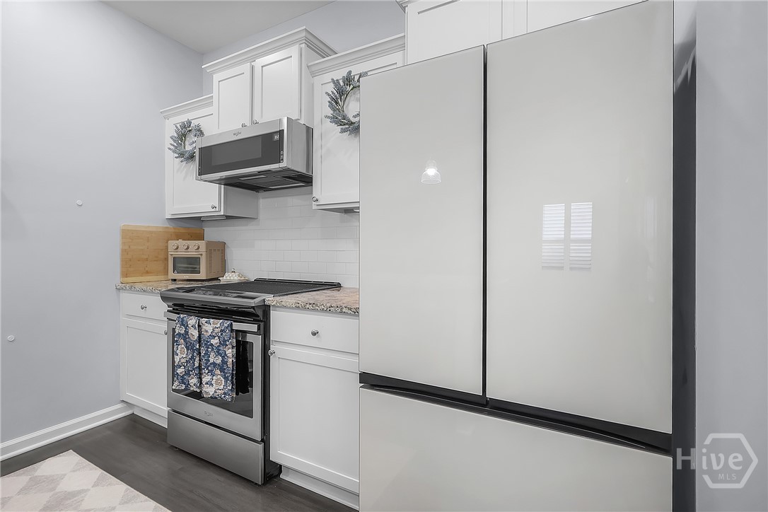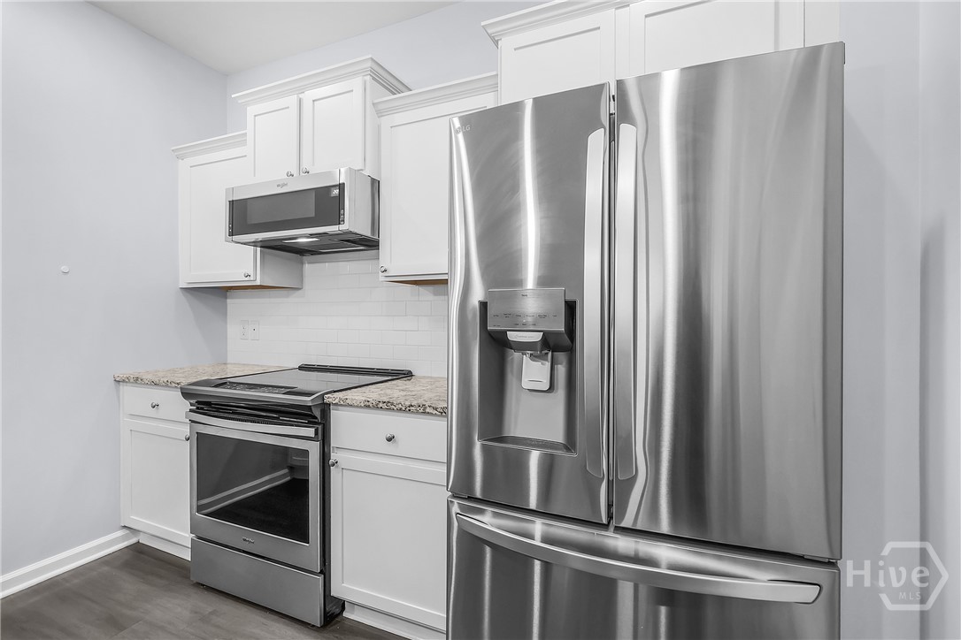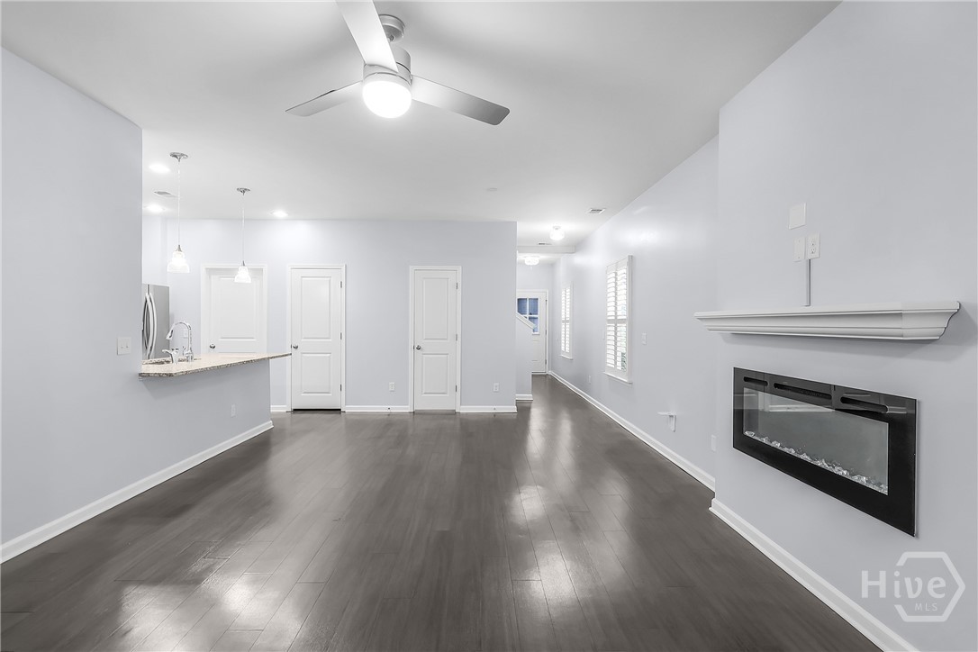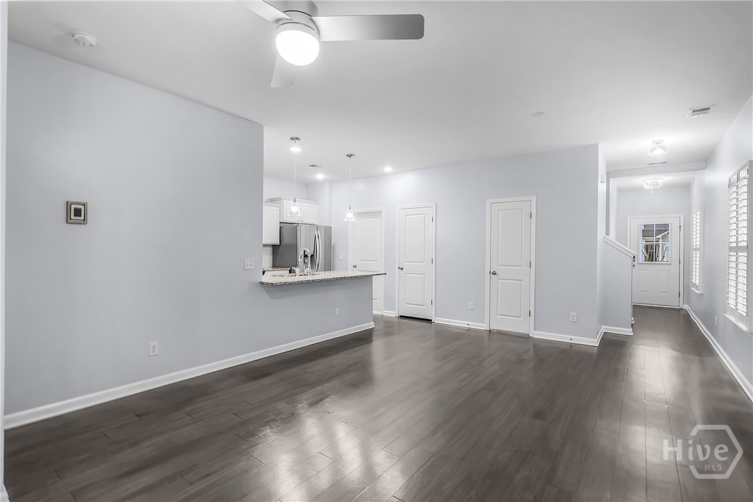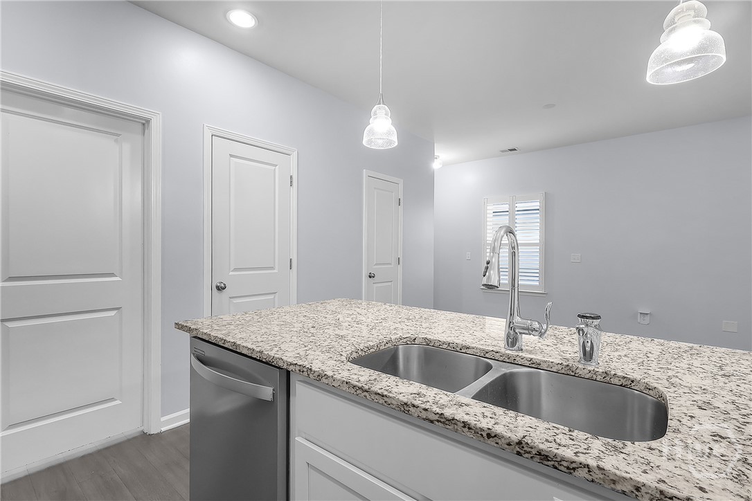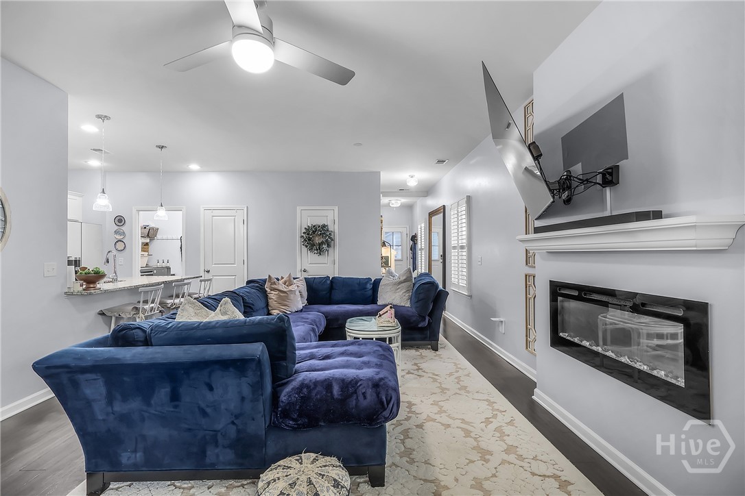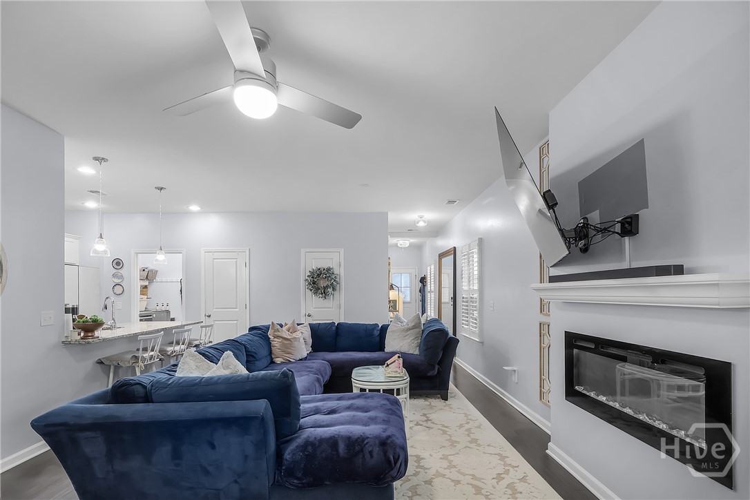 The kitchen is a true focal point, featuring granite countertops, a large island with bar seating, stainless-steel appliances, white cabinetry, subway tile backsplash, pendant lighting, and a deep double sink. The island overlooks the living space, making it ideal for gatherings, casual meals, and everyday use.
