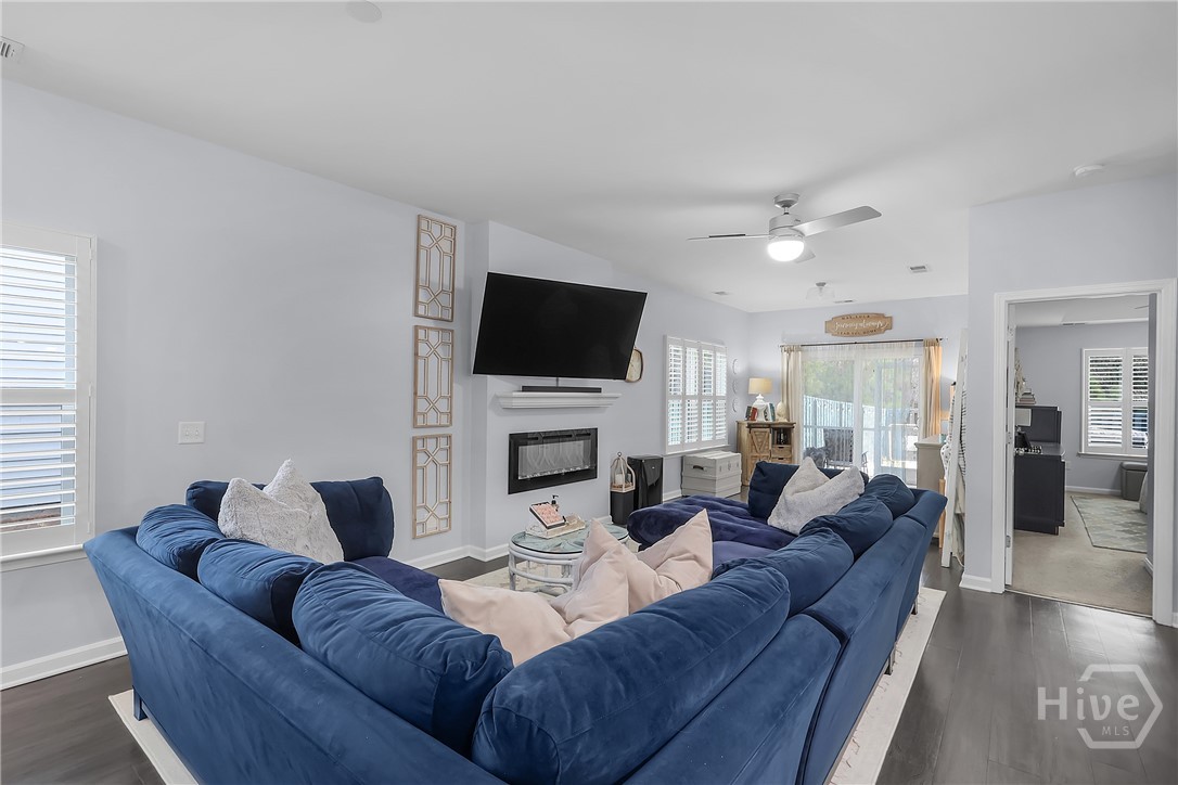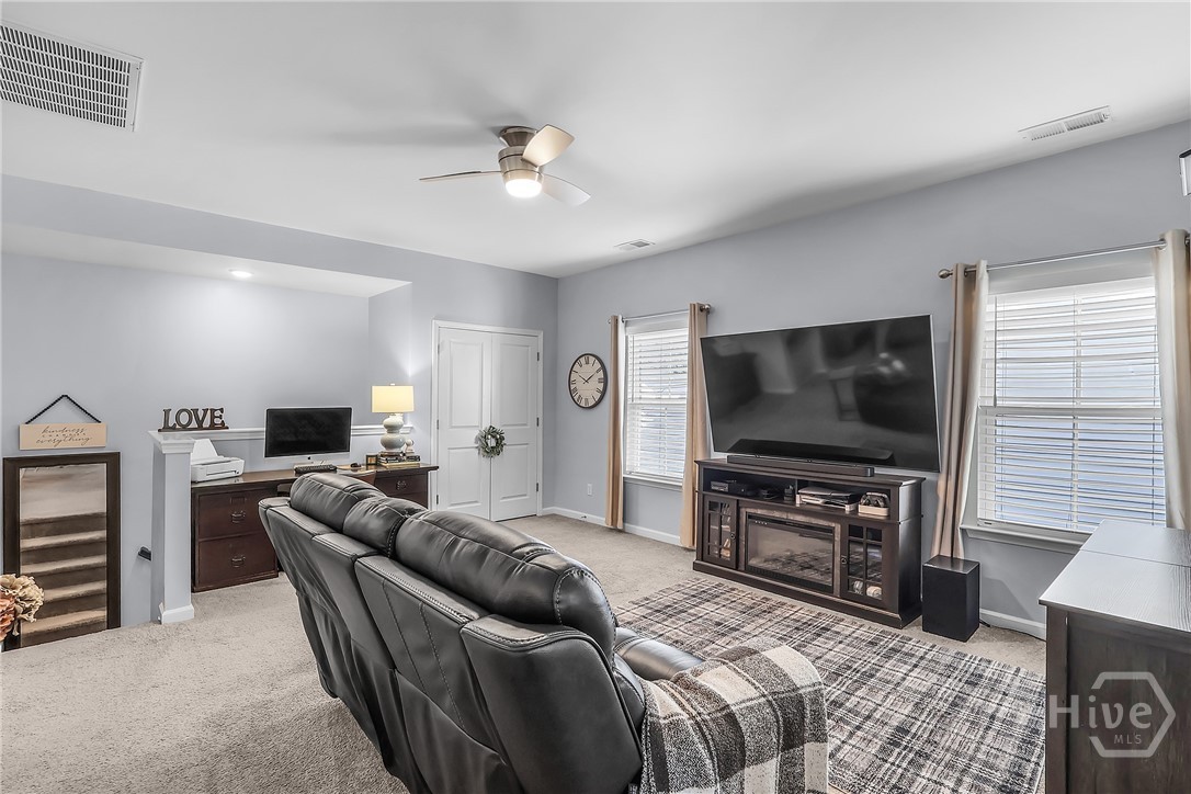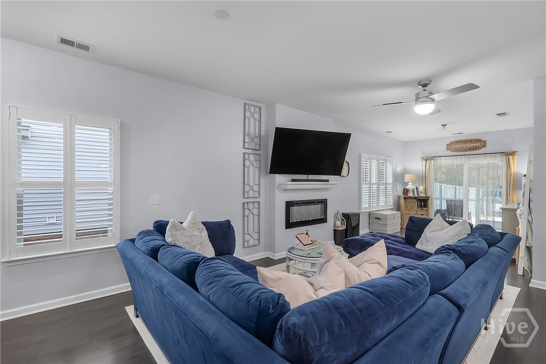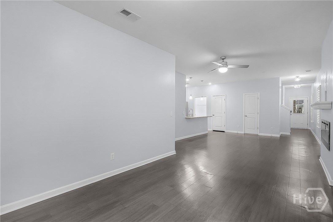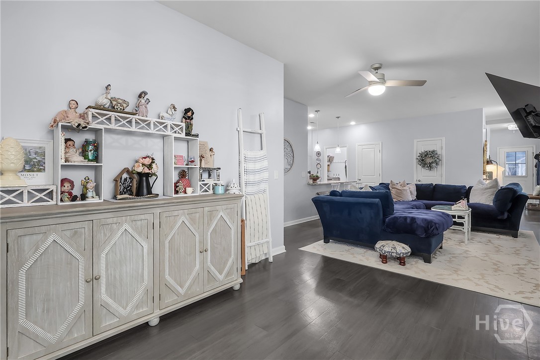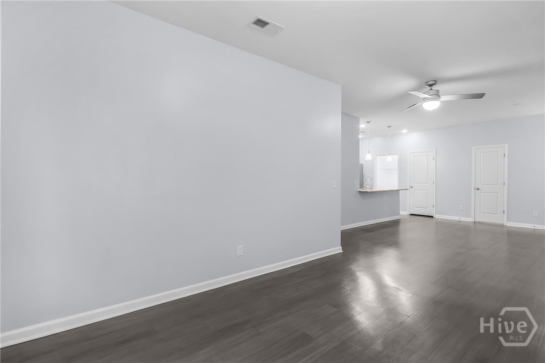 The kitchen is a true focal point, featuring granite countertops, a large island with bar seating, stainless-steel appliances, white cabinetry, subway tile backsplash, pendant lighting, and a deep double sink. The island overlooks the living space, making it ideal for gatherings, casual meals, and everyday use.
