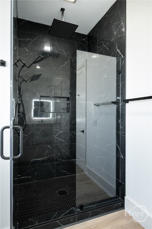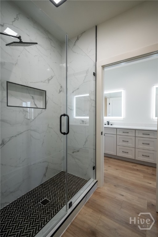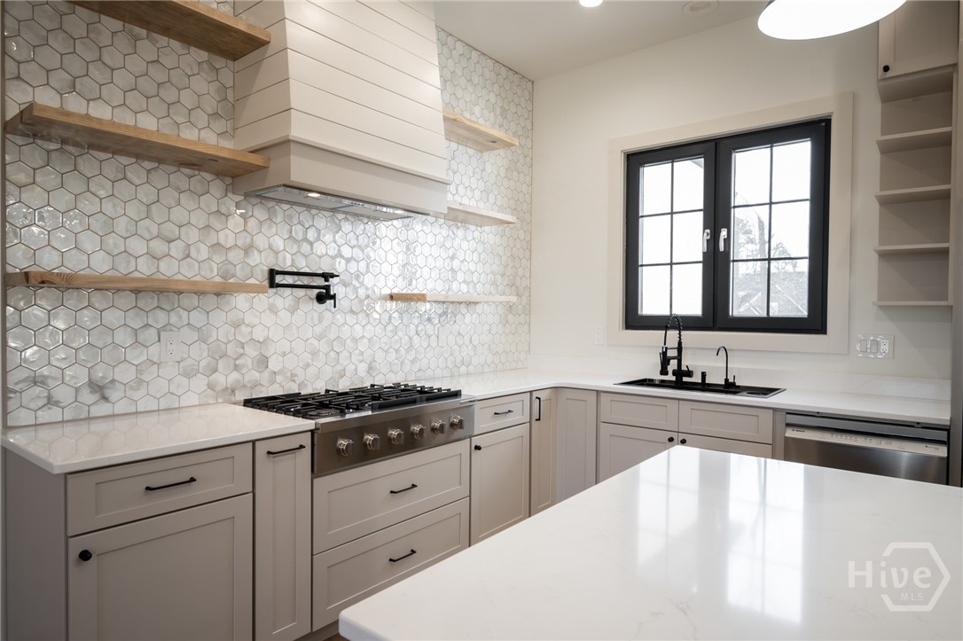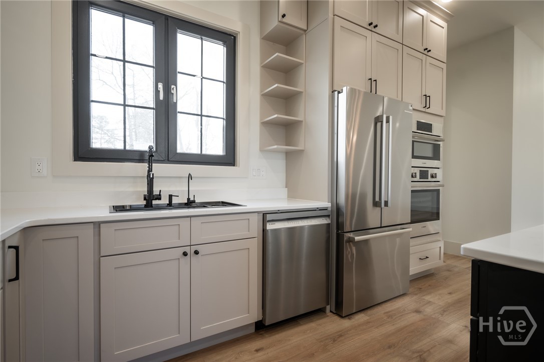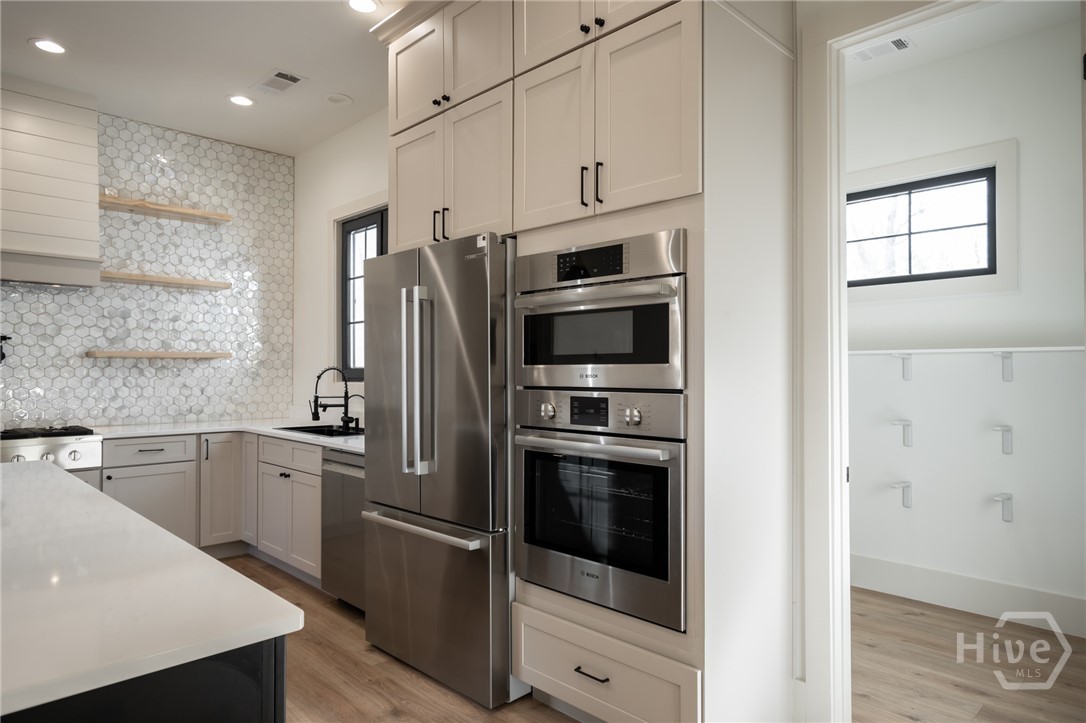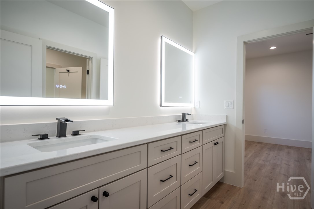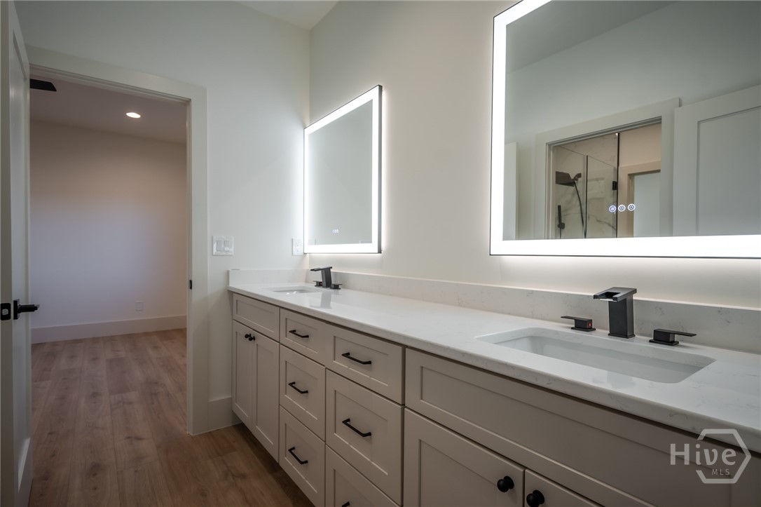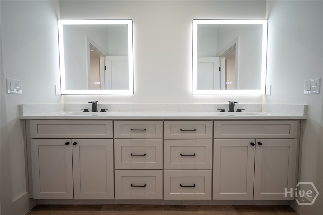 The chef’s kitchen anchors the home, featuring quartz countertops, a tile backsplash, stainless steel appliances, and a pot filler—perfect for weeknight pasta dinners as well as Sunday morning pancakes. It opens seamlessly into the main living area, creating an inviting flow for easy everyday living and entertaining. A large, walk-in, daylight pantry just off the kitchen adds abundant shelving— practical details that make a difference in the busy day to day hustle and bustle! If you like the feeling of fresh air coming through your home on a spring day, you’ll love the unique casement-type windows with two way function for venting and swinging open (rarely found in new construction in Georgia!). The bathrooms are equipped with high end, dimmable, large light LED, dual lighting mode, anti-fog, tempered glass.