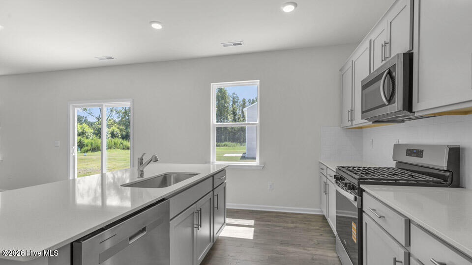The moment you step inside the home you will be greeted by the foyer which connects you first past the flex room, and then past the powder room and a storage closet. The foyer then opens into the large great room, overlooked by the kitchen. The open-concept layout integrates the great room with the kitchen, featuring stainless steel appliances, quartz countertops, a spacious center island, and a corner walk-in pantry.
