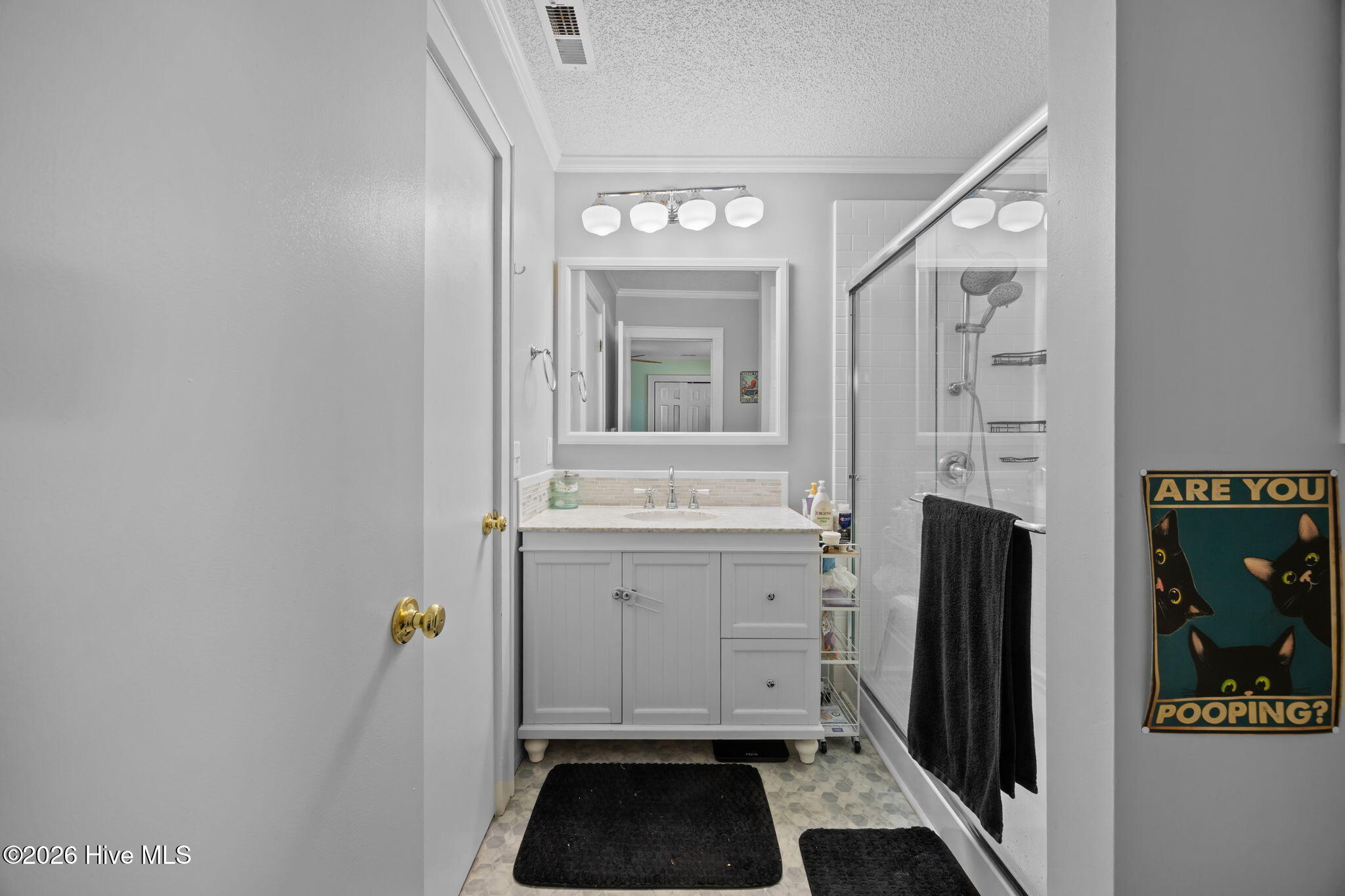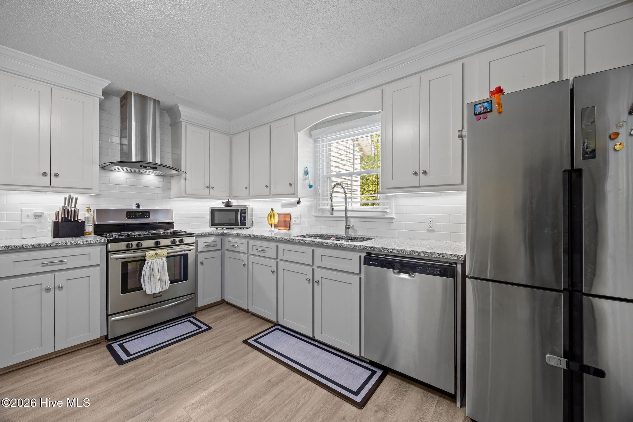 The kitchen features stainless steel appliances, granite countertops, and a gas stove, making it perfect for everyday cooking or entertaining. Bedrooms are accented with plantation blinds, and the utility room includes a farmhouse sink for added convenience.