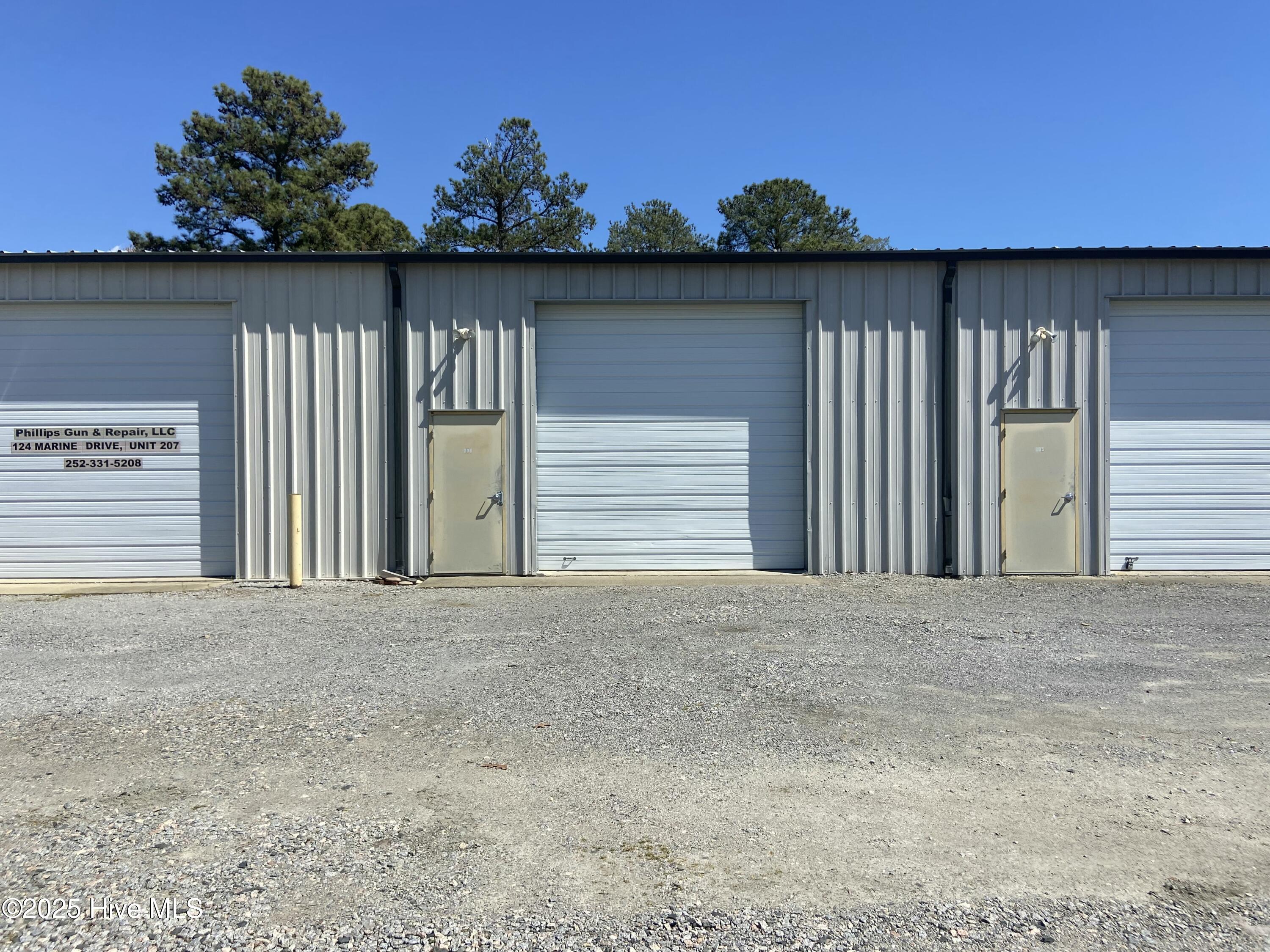 1250 sq ft warehouse unit 25′ wide by 50′ deep available with an 11′ by 18′ office and a 5′ by 7′ restroom. 12′ by 12′ overhead door with electric door opener, 36” wide front and back doors, 13′-16′ ceiling height and 100 amp power. No HVAC except bathroom heater. Located near the Edenton Airport off Soundside Road. No hvac other than bathroom heater. Additional units including adjacent 1,250 sq ft units is available for same price.