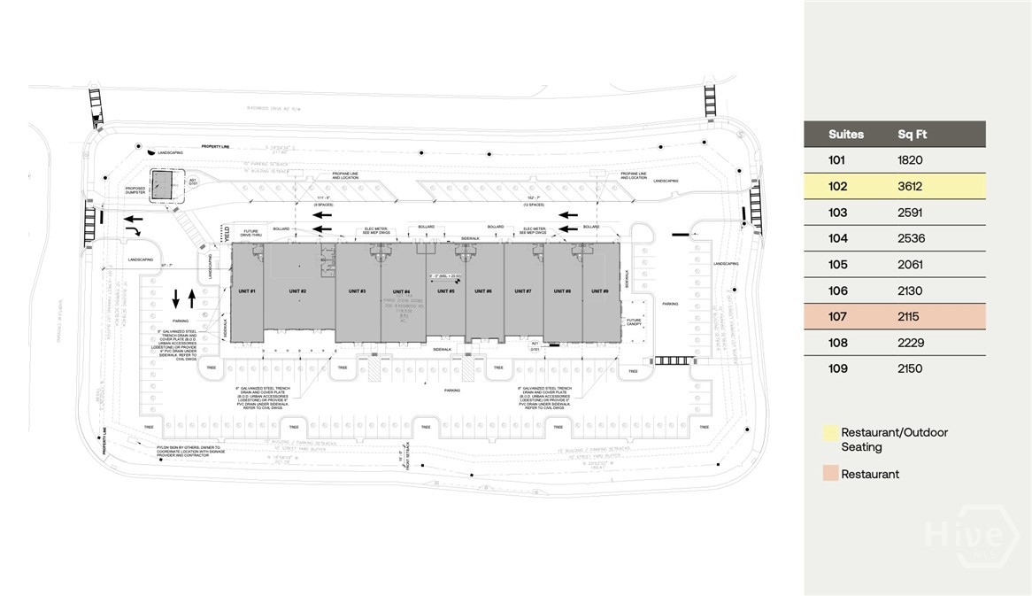Jimmy DeLoach, and the future Effingham Parkway (opening mid-2026). Units range from 1820sf – 9000sf in size with 2 units builtout for restaurant use, one with patio space. Ideal for restaurant, medical, retail, and neighborhood services, with high visibility, dense rooftops, and strong traffic. Currently under construction with plans of completion to be around July/August of 2026.