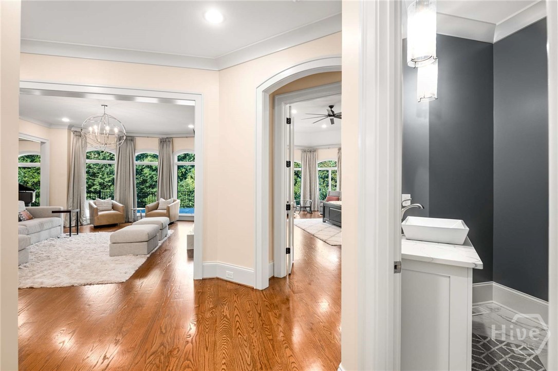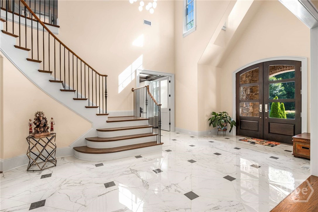 An Unparalleled Estate in The Georgia Club! Situated on 2.69 acres, this custom French Country estate offers over 12,000 sq ft of refined living. A circular drive, stone and brick accents, and dramatic curved staircase welcome you inside soaring ceilings, marble-like floors, and designer finishes. The main level features a lavish primary suite with dual quartz vanities, spa shower, soaking tub, makeup station, and custom closets, plus formal dining, living room with quartz fireplace and built-ins, office, gourmet kitchen with bold quartz island, Thermador appliances, walk-in pantry, keeping room, and mudroom with custom cabinetry. Upstairs offers a second primary suite, 3 en-suite bedrooms, playroom, office, and laundry. The terrace level includes a full kitchen, game room, gym, theater/flex space, hobby room, and direct access to the backyard retreat with heated saltwater pool, spa, grotto, patios, firepit, and six-car garage. (Annual Service Fee is $428.00)